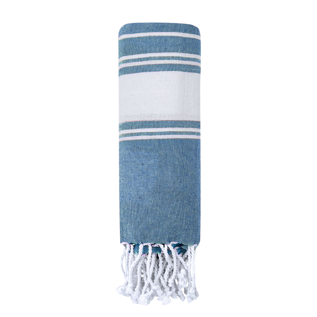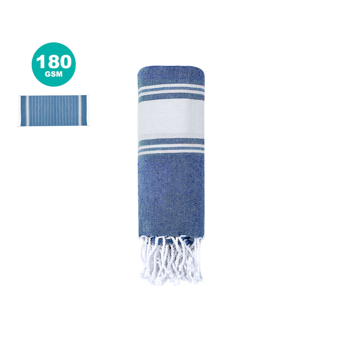 Suave pareo de toalla de 180g/m2 en combinación de algodón y poliéster. Disponible en variada gama de colores en tono bicolor. Presentado individualmente en bolsa.