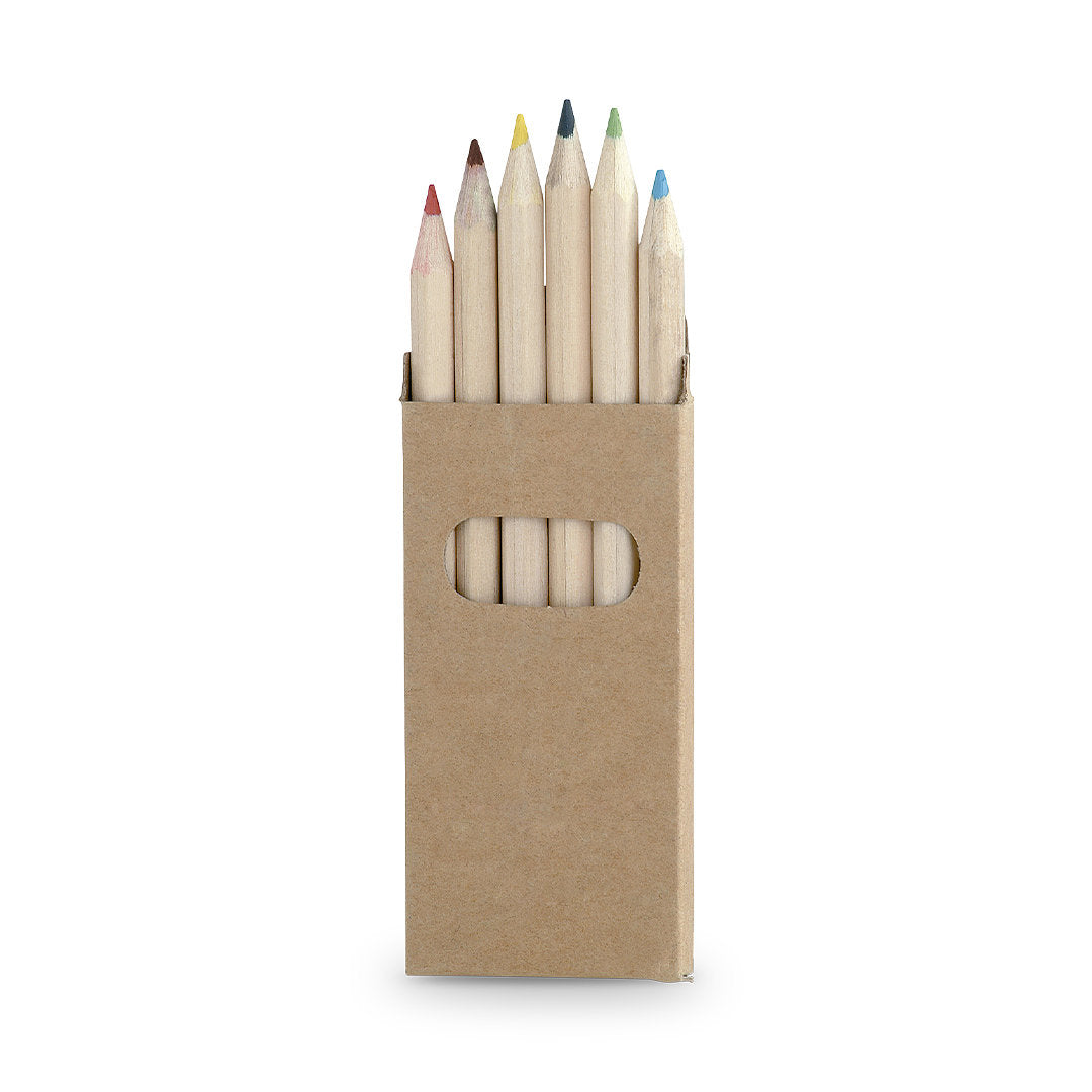 Set de 6 lápices en caja de cartón natural con ventana. Lápices de madera con cuerpo hexagonal de acabado natural y minas en variada gama de colores.