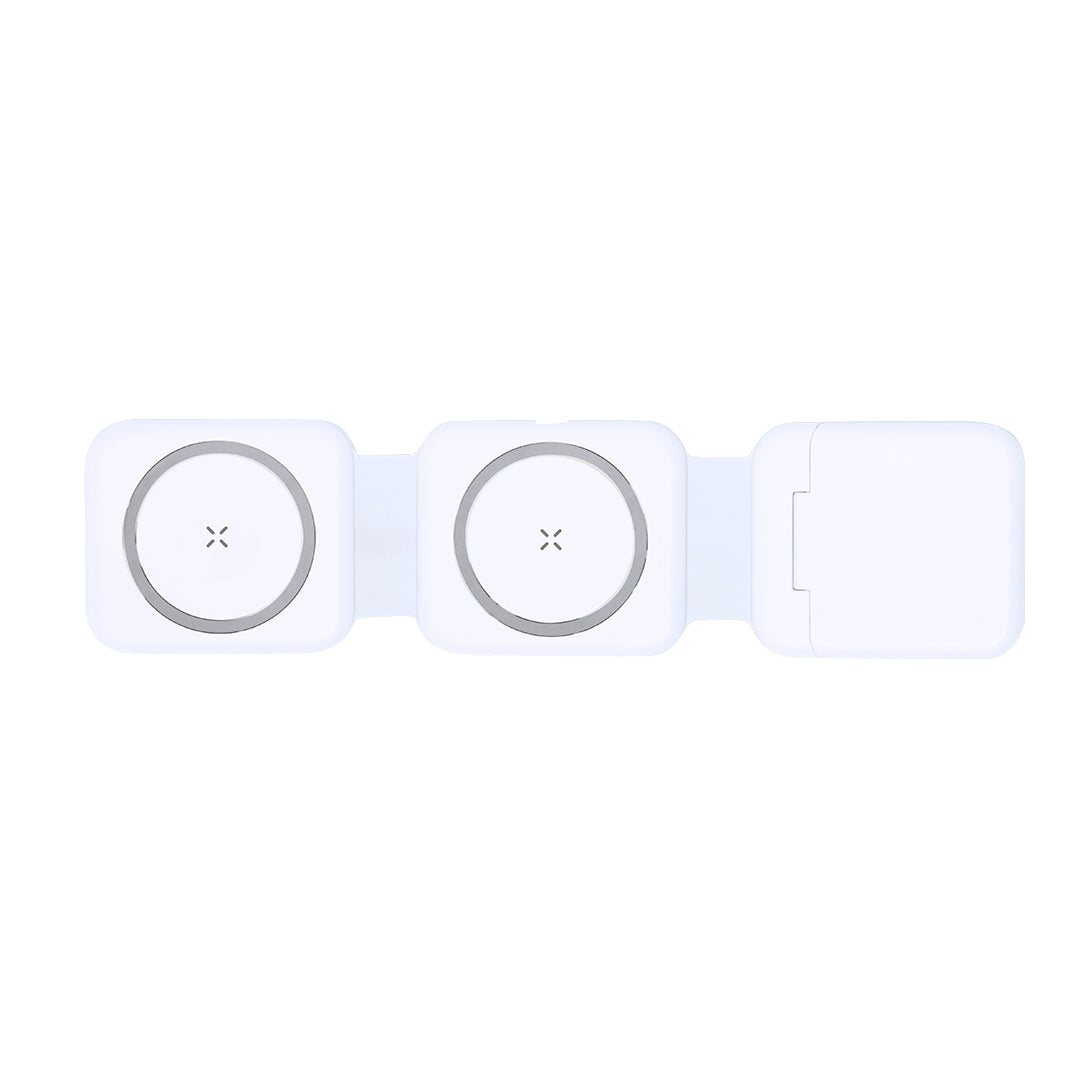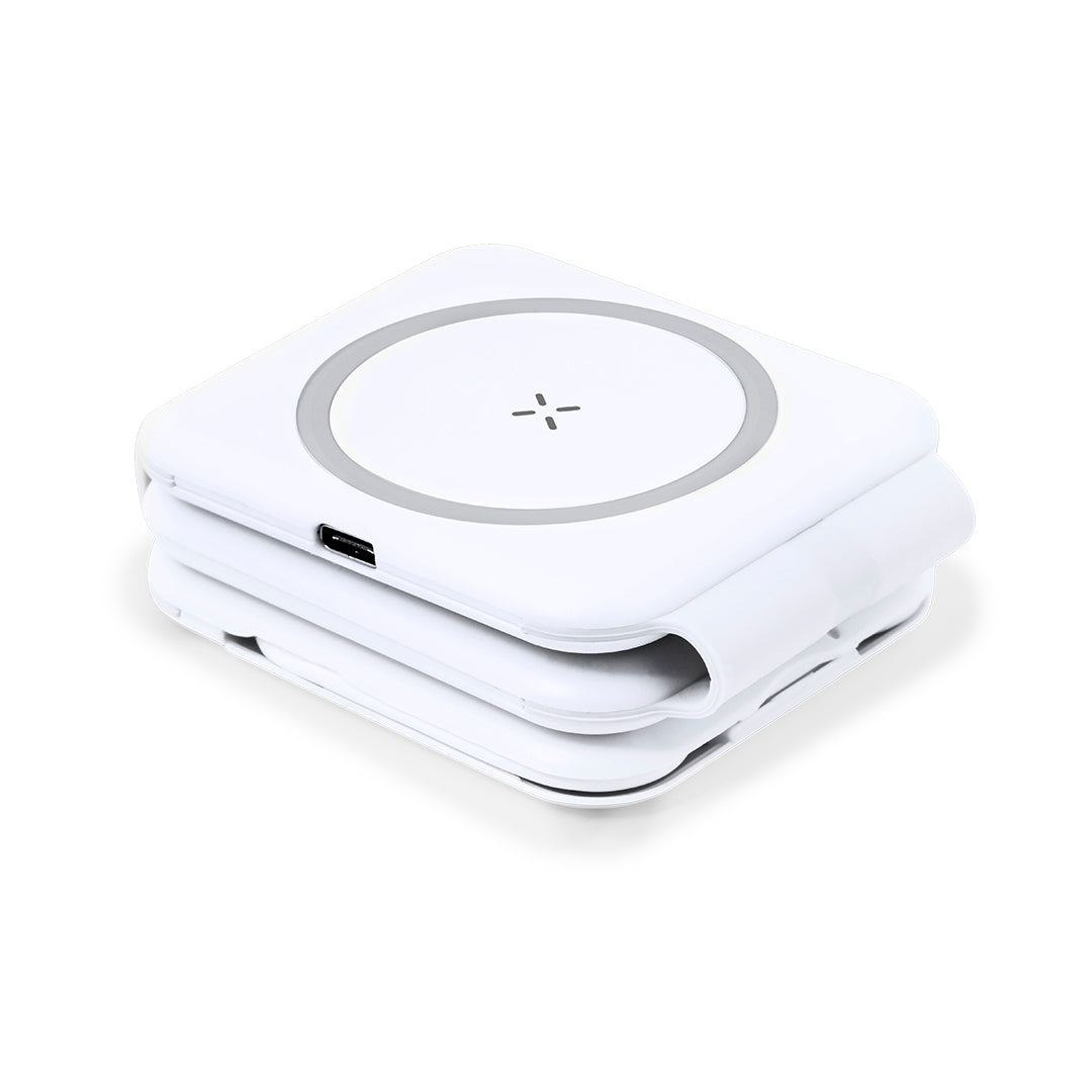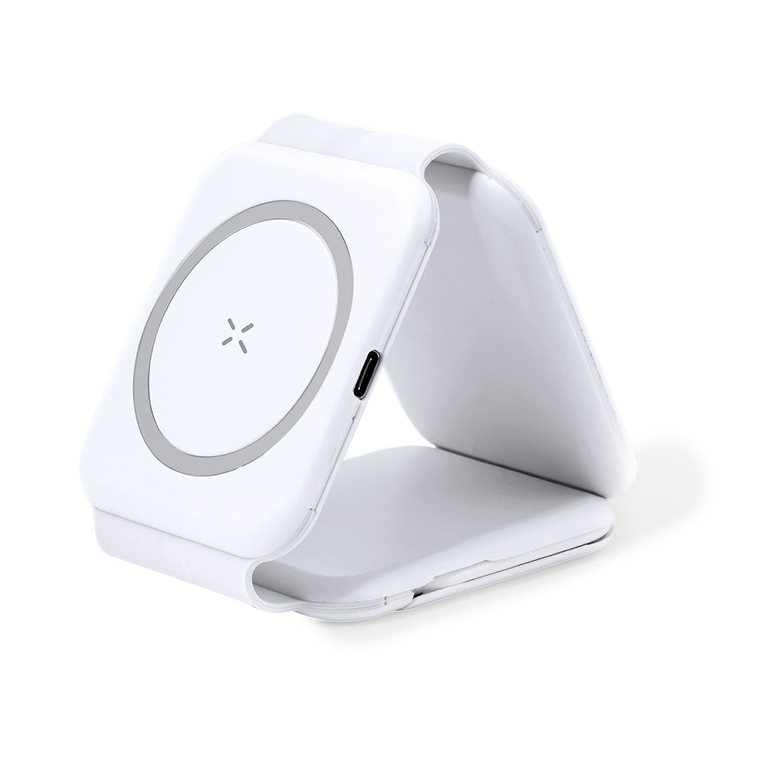 Completo cargador inalámbrico magnético 15W, diseñado para la carga simultánea del smartphone, auriculares y smartwatch. Se trata de un gadget todo en uno: plegable, portable, de tamaño compacto y muy versátil. Incluye set de cables cargadores sincronizadores -aptos para transferencia de datos- con conexiones Micro USB, Tipo C y Lightning. Además, incorpora un accesorio eyector para tarjeta SIM. Elaborado en resistente ABS de color blanco y presentado en atractiva caja individual de diseño. Disponible manual de instrucciones en español e inglés.Fabricado conforme a los estándares RoHS y en cumplimiento con los siguientes requisitos de seguridad: Sistema de protección contra sobrecalentamiento. Sistema de protección contra sobrecarga. Sistema de bloqueo para evitar cortocircuitos.