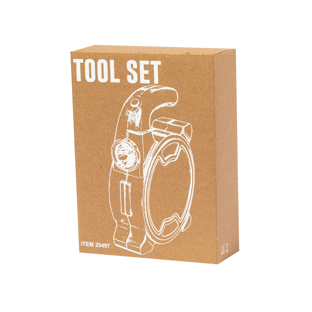 Set de herramientas en estuche de ABS con linterna incorporada y mango ergonómico, provisto con 4 Leds alimentados por 3 pilas AAA (no incluidas). Dispone de 21 accesorios en su interior: destornilladores de precisión (planos y philips), mango multifunción para cabezales compatibles (philips, planos, estrella, adaptador), llaves de tubo y flexómetro. Presentado en caja de diseño kraft.