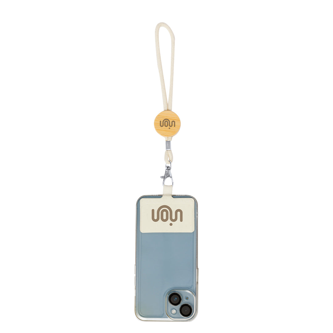 Original pulsera portamóvil en suave algodón, adaptable a todo tipo de muñecas. Con accesorio de transporte para situar entre la funda y el smartphone. Pieza central de bambú para personalización, especial para grabado en láser. Presentado individualmente en bolsa de papel reciclado.Materiales como el bambú fomentan la utilización de materias primas naturales, reduciendo las emisiones contaminantes. Proviene de una planta de gran resistencia y versatilidad, con crecimiento y regeneración rápidos, siendo una excelente alternativa al uso de madera tradicional.