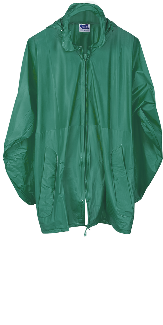 Impermeable en resistente PVC de acabado termosellado en variada gama de colores. Con capucha de cremallera integrada en cuello, cierre principal de cremallera y con bolsillos laterales. Convertible en riñonera con cintas elásticas y cierre de buckle a juego. Disponible en tallas M-L, XL-XXL.