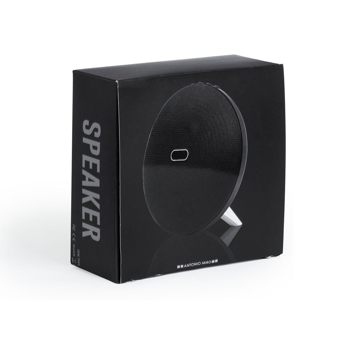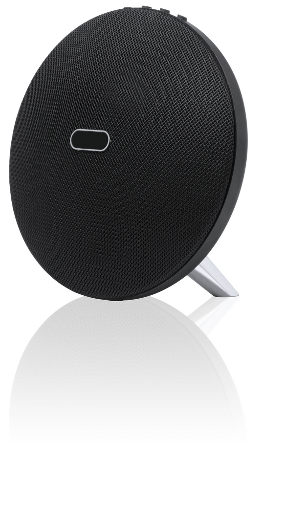 Altavoz de conexión Bluetooth en elegante acabado de color negro con accesorioss en plateado y original diseño circular. Ofrece 8W de potencia, tiene función de manos libres, una ranura para tarjetas micro SD de hasta 32 GB de capacidad y entrada auxiliar de línea mediante conexión jack de 3,5mm. Compatible con iOS y Android, incluye cable de carga mini USB, cable auxiliar jack de 3,5mm y viene presentado en atractiva caja de diseño. Con soportes de goma antideslizantes en la base.