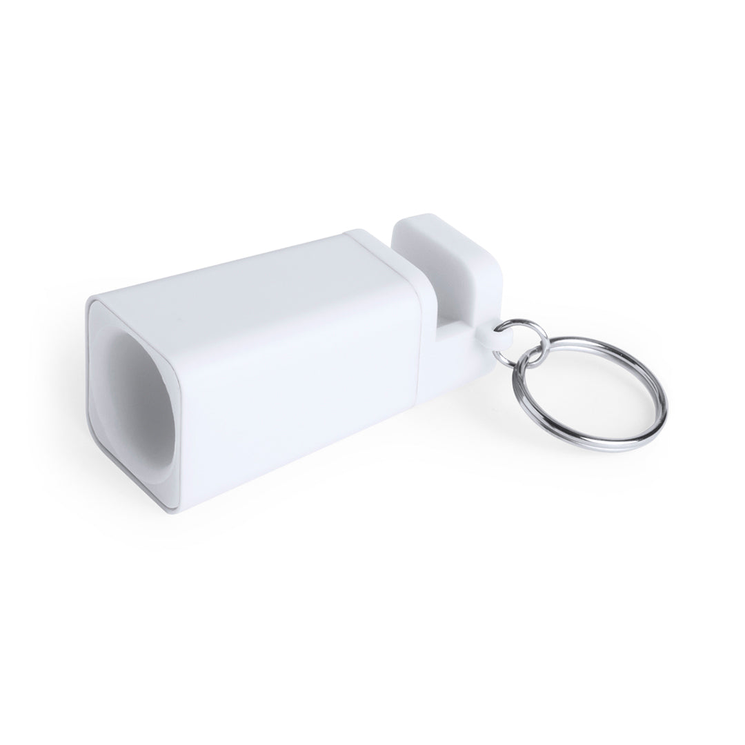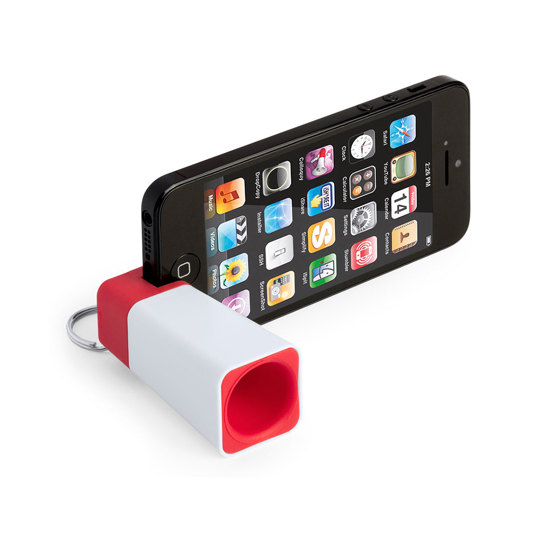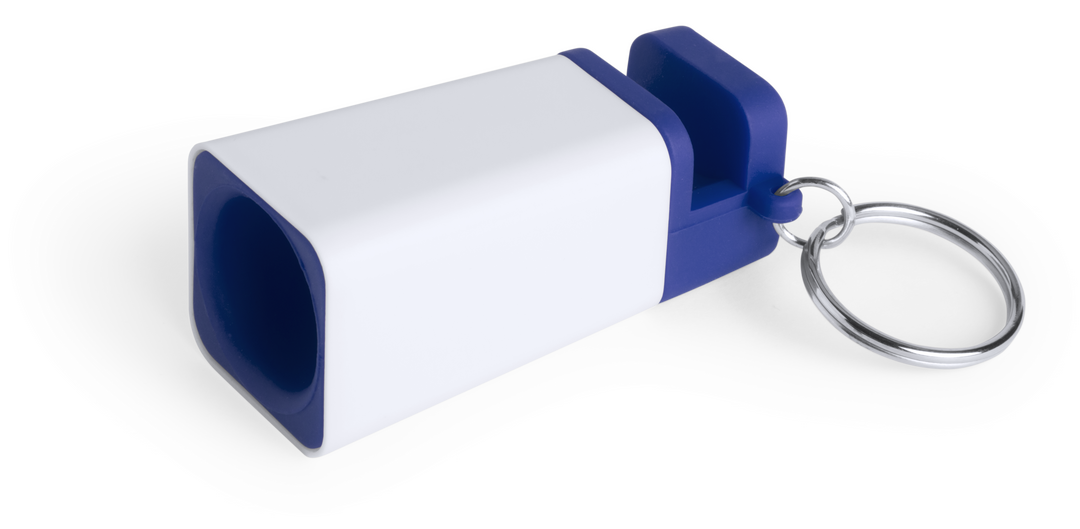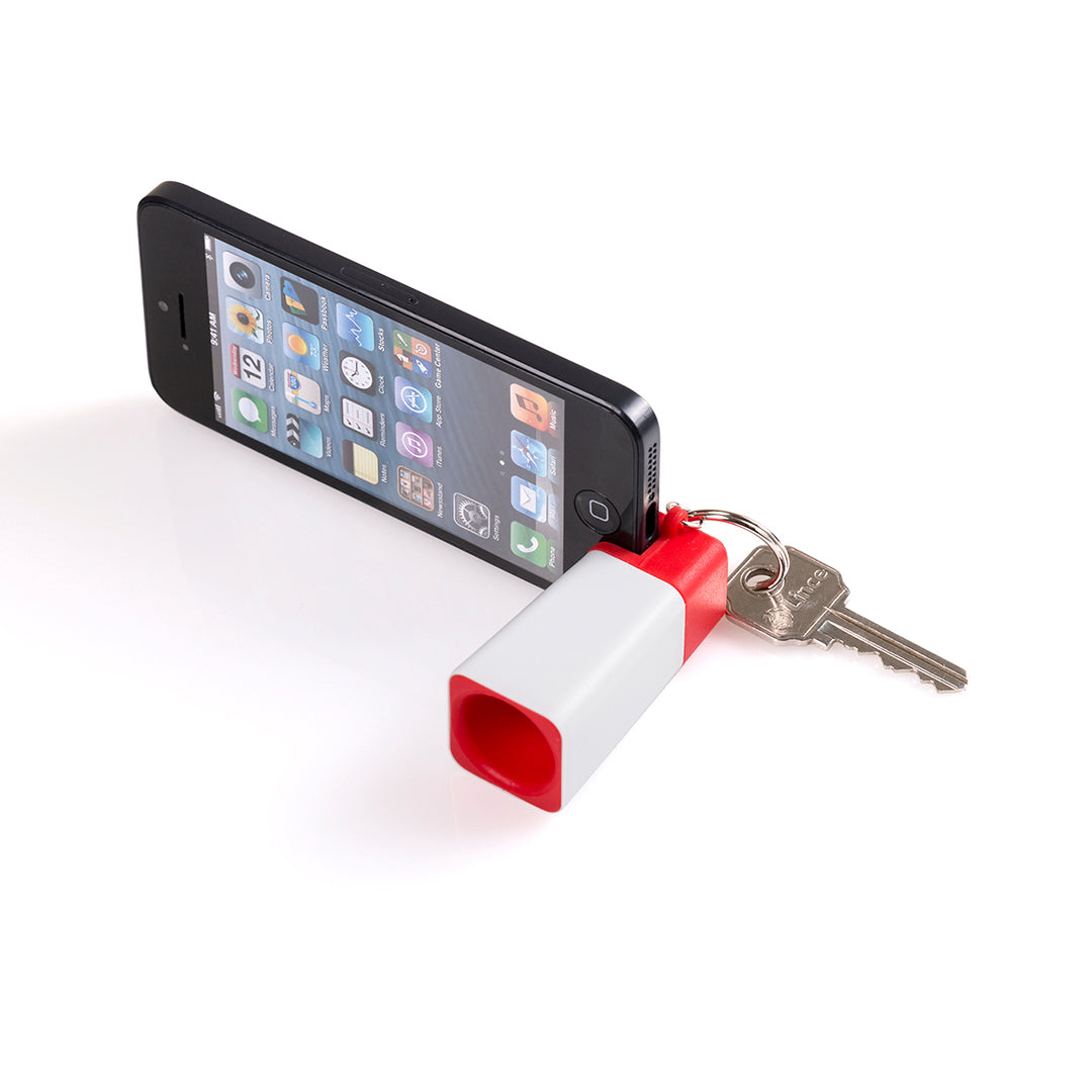 Altavoz llavero con función soporte, de diseño minimalista en original acabado bicolor y especialmente diseñado para marcaje en tampografía.