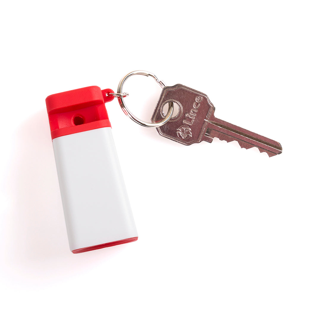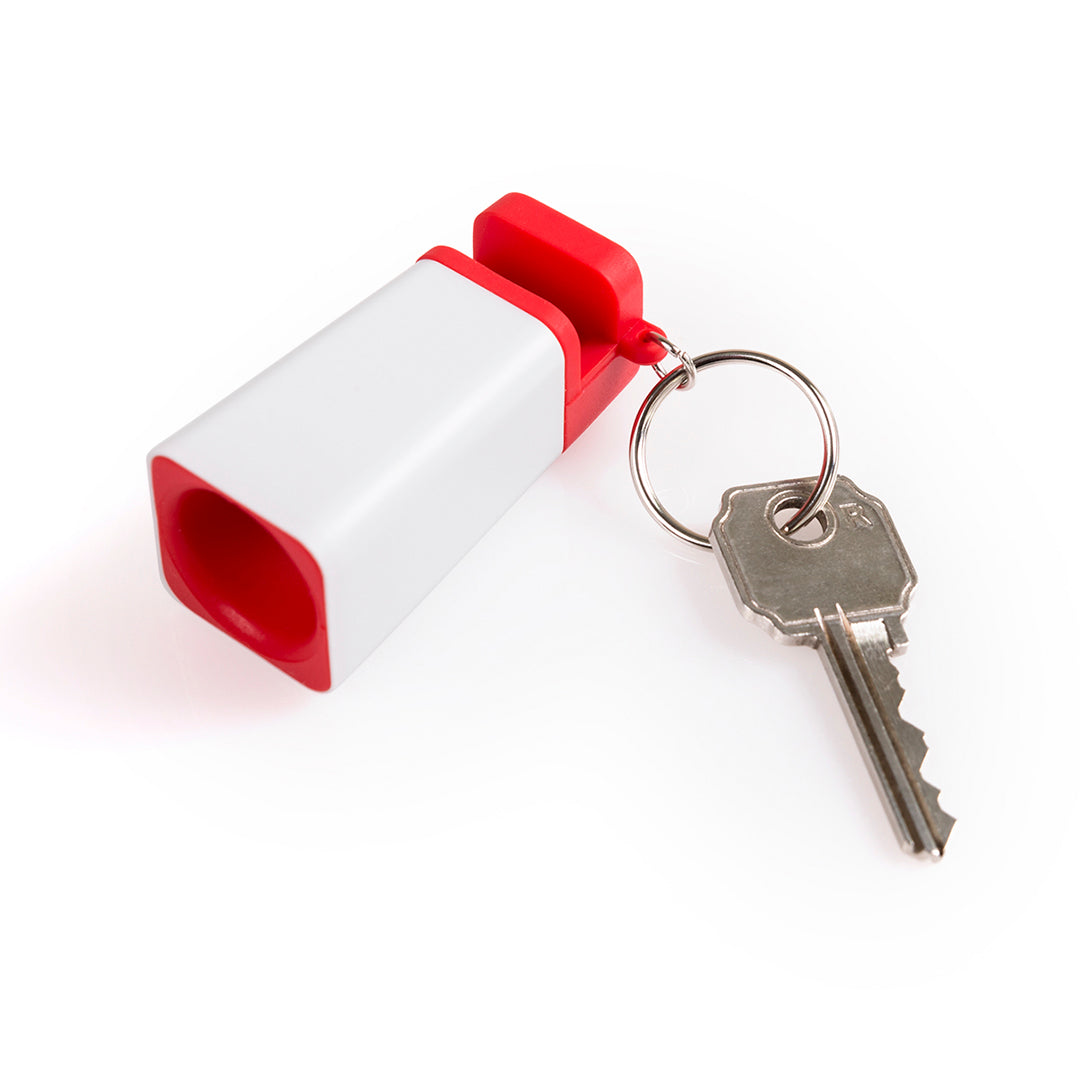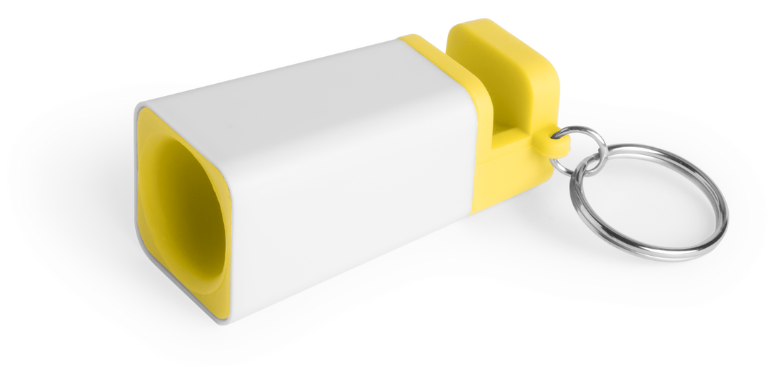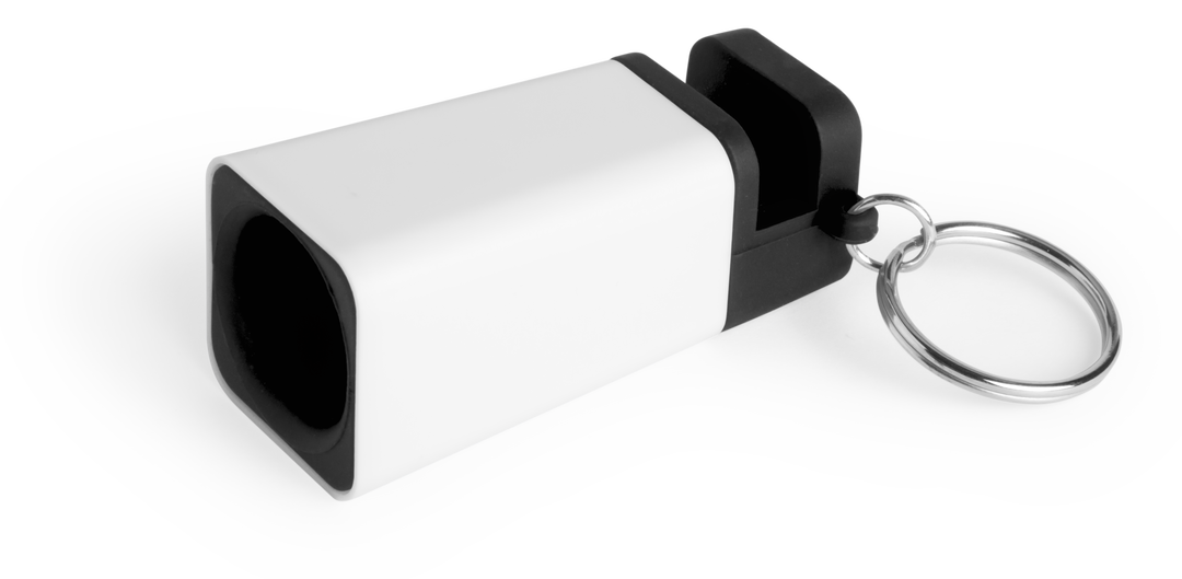Altavoz llavero con función soporte, de diseño minimalista en original acabado bicolor y especialmente diseñado para marcaje en tampografía.
