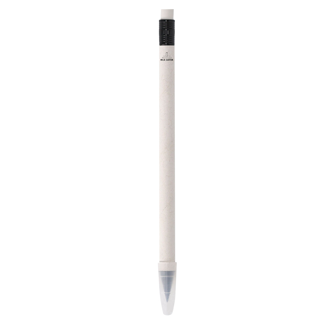 Lápiz eterno fabricado con cartones de leche reciclados. Reutilizable y con escritura infinita. Incluye goma de borrar en la parte superior del lápiz y capucha de protección. De color blanco, con detalles en negro. Con distintivo de cartón de leche reciclado en el cuerpo.Los cartones de leche se componen en su mayor parte de cartón y aluminio. Durante su proceso de reciclado, se separan los distintos materiales del envase para su reutilización y nuevo uso, contribuyendo así a recorrer el camino infinito de la economía circular. Este material se caracteriza por su alto grado de reciclabilidad, así como por su ligereza y resistencia.