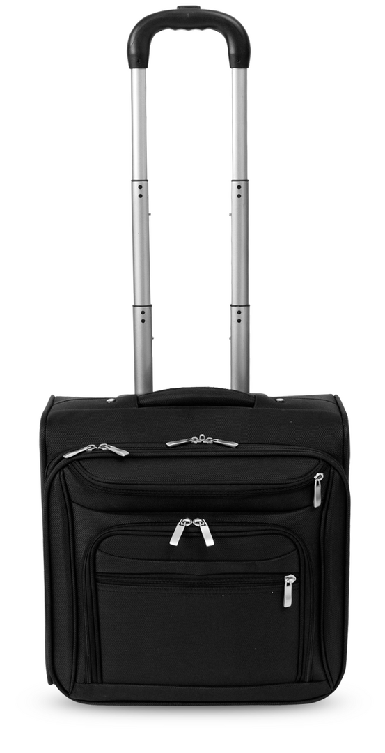 Trolley de negocios multibolsillo de 2 ruedas acabado en resistente poliéster 1680D. De elegante color negro, con asa exterior reforzada a juego, cremalleras con orificio para candado -incluido- y prácticos bolsillos en parte frontal. Con identificador, cierre de seguridad de combinación numérica y cremalleras a juego, incluye además compartimento interior acolchado para ordenador portátil de hasta 17 pulgadas y multitud de bolsillos y fundas para bolígrafos interiores.