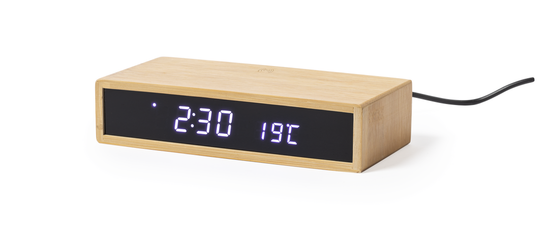 Reloj multifunción de línea nature, con cargador inalámbrico 5W integrado. Fabricado en bambú procedente de cortes naturales. Función fecha y hora, alarma y termómetro. Alimentación mediante conexión USB, con cable micro USB y adaptador de pared incluido. Pila de botón incluida que permite guardar los datos en caso de desconexión. Compatible con dispositivos equipados con tecnología de carga inalámbrica y presentado en atractiva caja de diseño. Disponible manual de instrucciones en español e inglés.