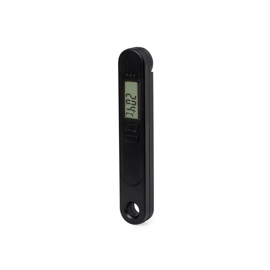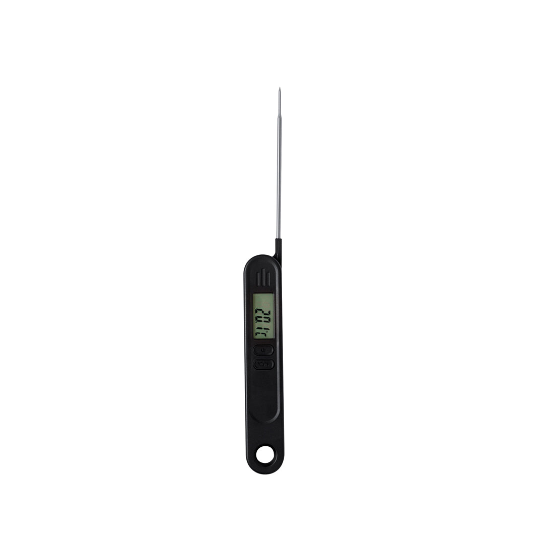 Termómetro digital con sonda metálica. Óptimo para la medición de temperatura en el interior de los objetos gracias a su punzón metálico. Práctico mecanismo de plegado para guardarlo de forma segura en cualquier sitio, con anilla e imán en la parte trasera. Pantalla LCD, con botón ON/OFF y posibilidad de medir en grados centígrados (Cº) o Fahrenheit (ºF). Rango de medición entre -50ºC y hasta 300ºC, con manual de instrucciones en español e inglés. Alimentado por pila de botón (incluida) y presentado individualmente en caja de diseño kraft.