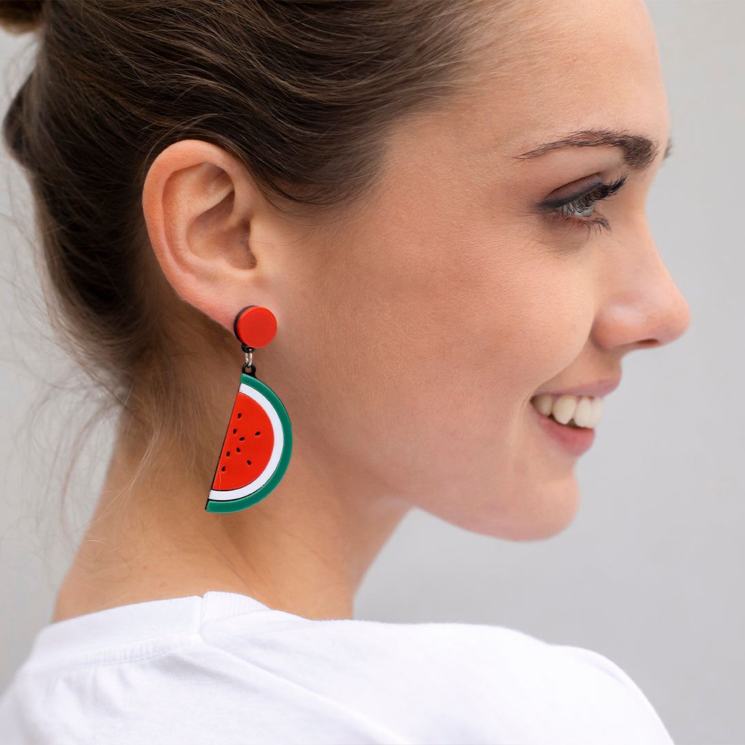 Fresca y original colección de pendientes frutales. Cautivadores y llenos de color, tienen forma de fresa, pitaya, manzana, sandía o limón, siendo una declaración de estilo. Fabricados con atención a los detalles y con cierre de clip. Presentados individualmente en cartón blanco y embolsados.