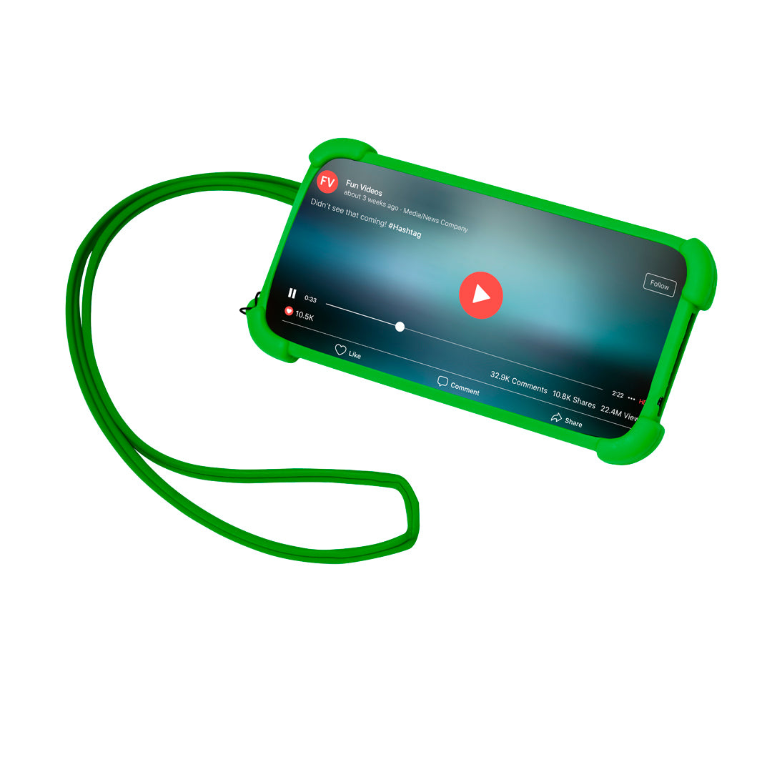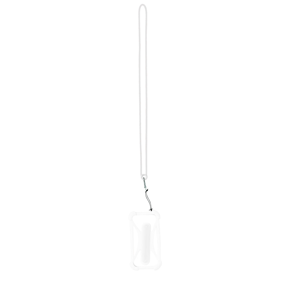 Práctico lanyard fabricado en resistente silicona. Incluye un accesorio para el móvil a juego, reforzado en las esquinas y con un soporte desplegable en la parte posterior. Con mosquetón metálico giratorio y disponible en variada gama de colores.