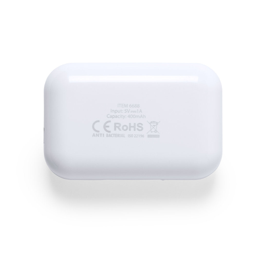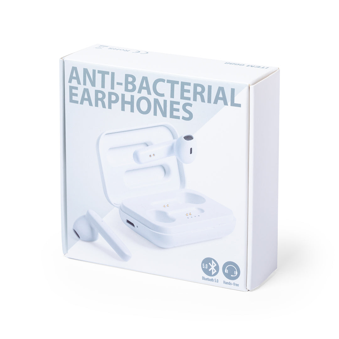 Auriculares antibacterianos intraurales en elegante acabado blanco y conexión Bluetooth 5.0. Fabricados en resistente material ABS brillo y de diseño ergonómico, incluyen botón de control táctil integrado en el auricular, con base de carga a juego. Función manos libres y recargables, con cable micro USB incluido. Presentados en estuche individual de lujo con tapa de bisagra y en atractiva caja de diseño. Los productos con tratamientos antibacterianos son capaces de reducir drásticamente las cargas bacterianas presentes en las superficies de los materiales, gracias a la incorporación de agentes microbianos permanentes estáticos, con alta efectividad para inhibir y prevenir la contaminación bacteriana. Artículo de acuerdo al estándar ISO 22196, que determina la actividad antibacteriana en materiales plásticos y superficies no porosas, lo que permite conocer la efectividad de inhibición microbiana que tienen los aditivos sobre los objetos tratados mediante una evaluación cuantitativa.