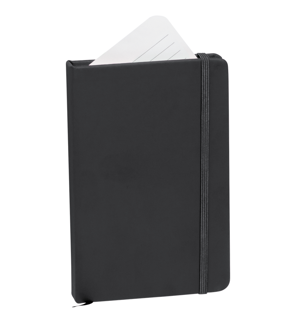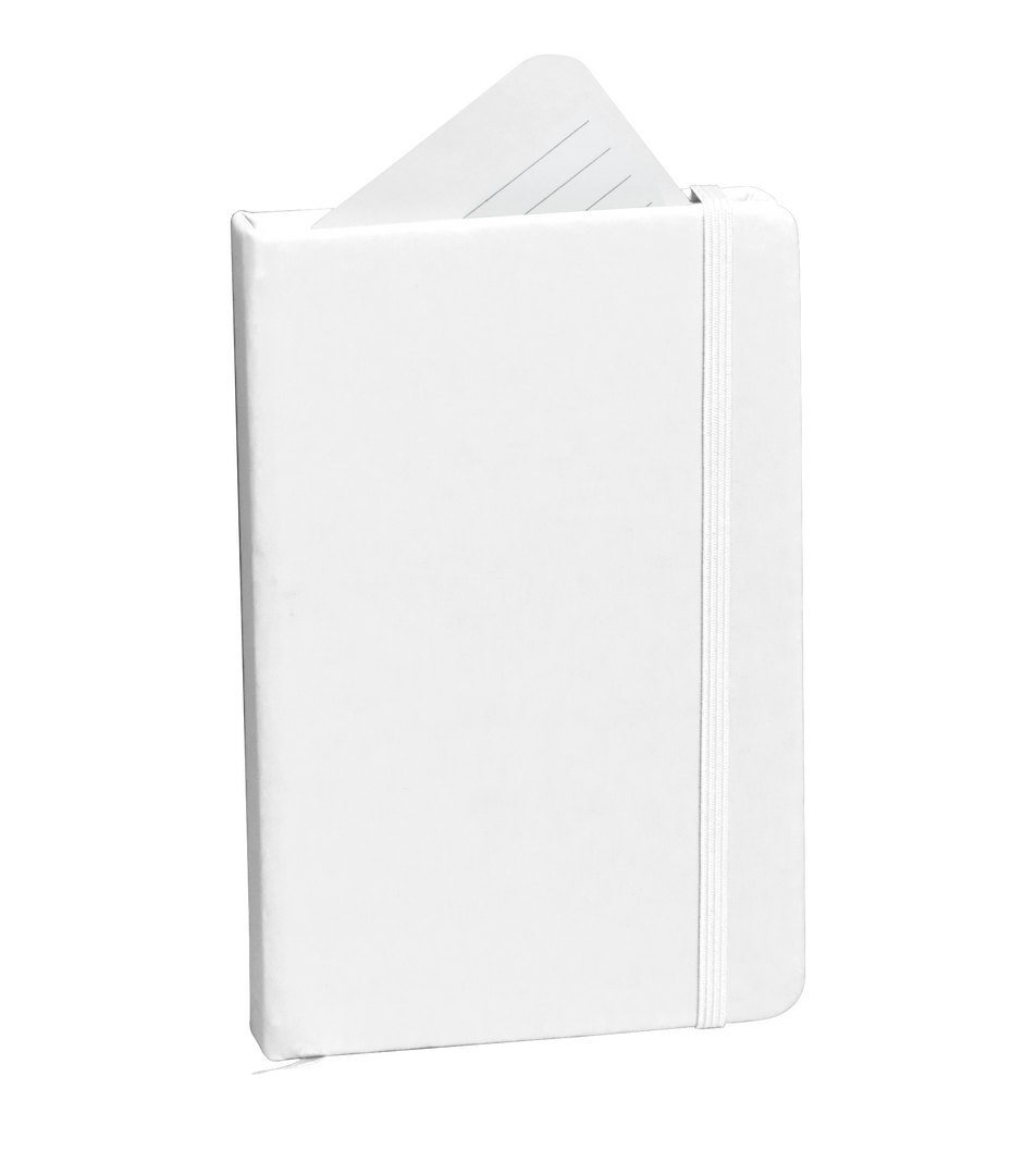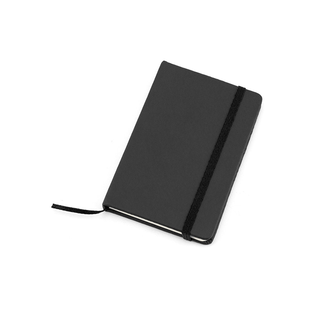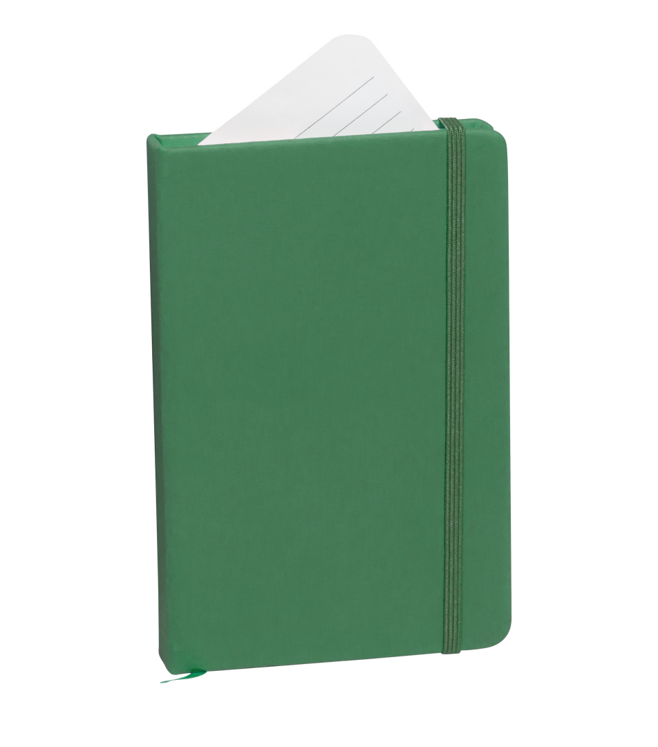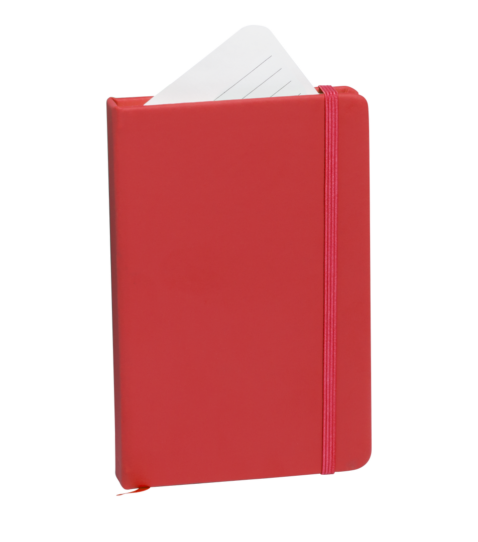 Bloc de notas con tapas de suave tacto, acabado en polipiel y en desenfadados colores. Con 100 hojas de distribución a una raya, elástico de sujeción y marcapáginas de tela a juego.