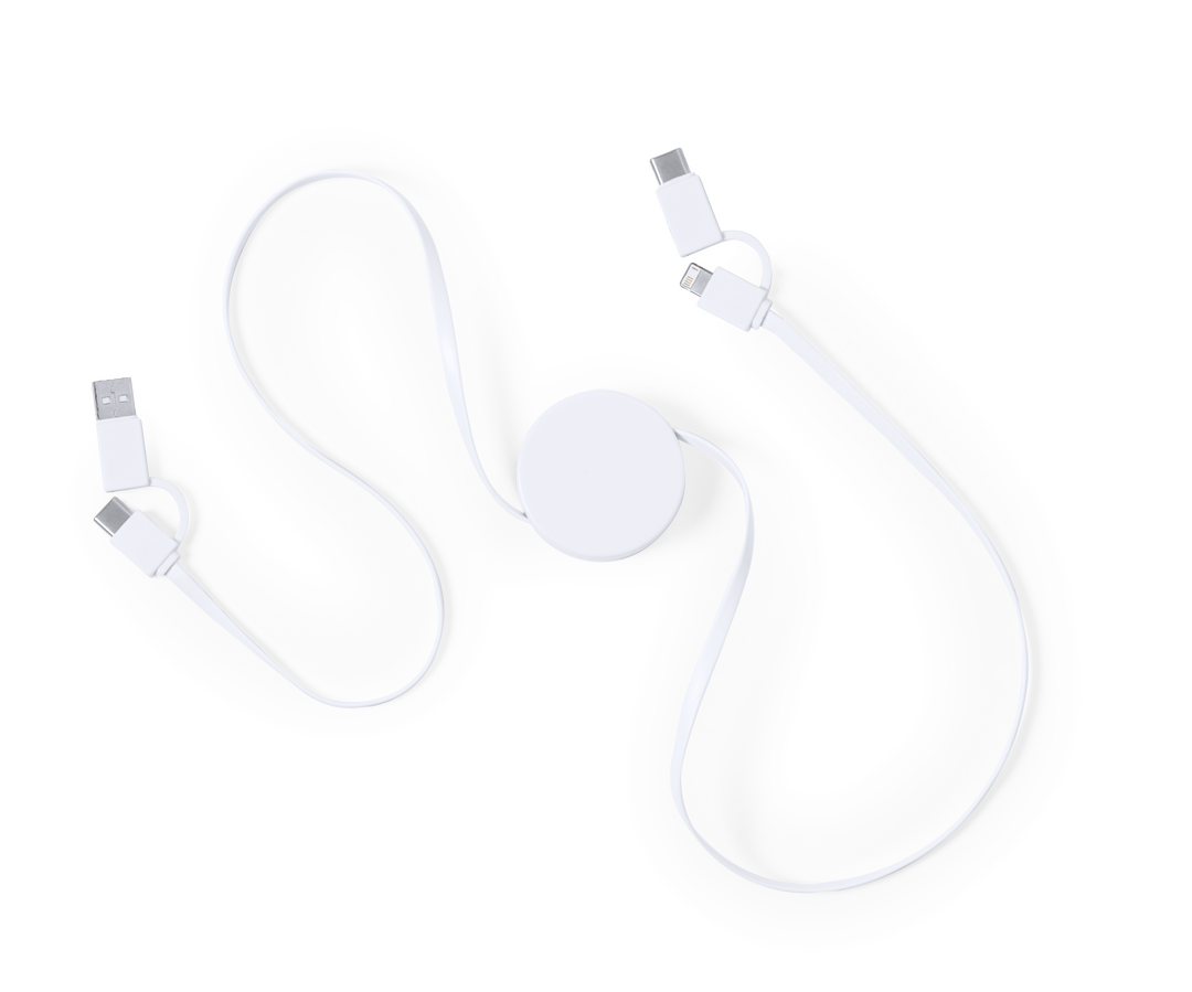 Cargador extensible de diseño ultra compacto. Conexiones Tipo C (entrada y salida), y dual Micro USB/Lightning. Función cargador y transferencia de datos. Amplia superficie de marcaje y presentado en bolsa individual.