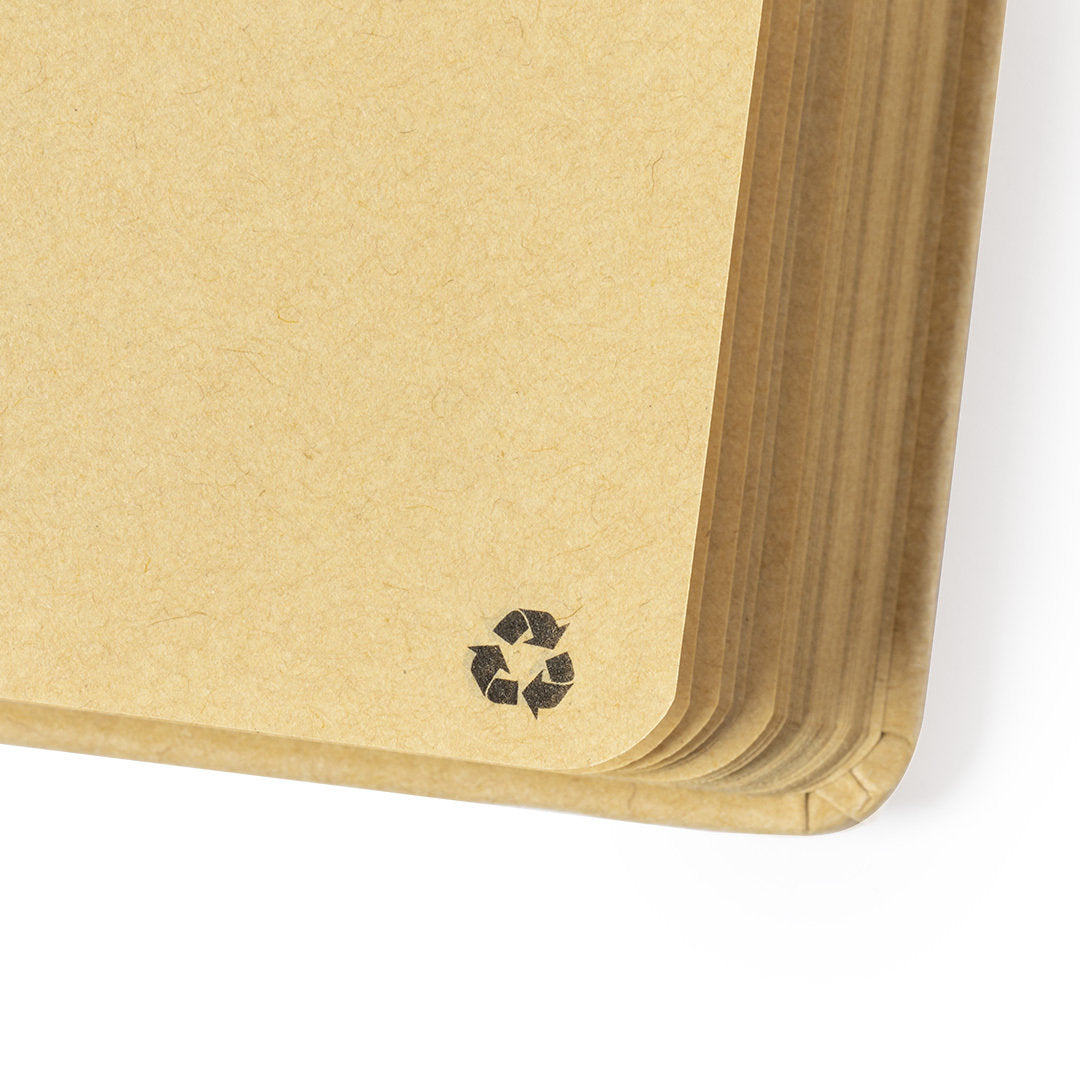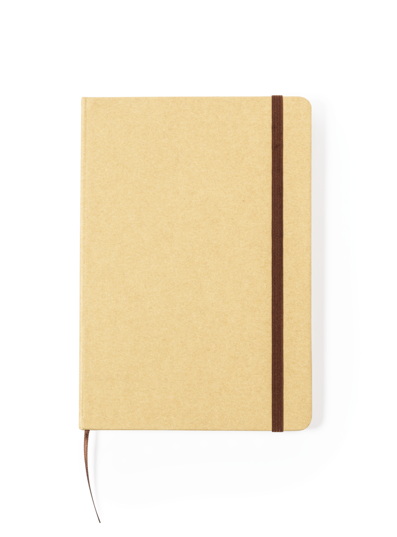 Bloc de notas A5 de línea nature, con tapas duras en resistente cartón reciclado. De 100 hojas lisas en acabado kraft con distintivo reciclado, con elástico de sujeción y marcapáginas de tela a juego.