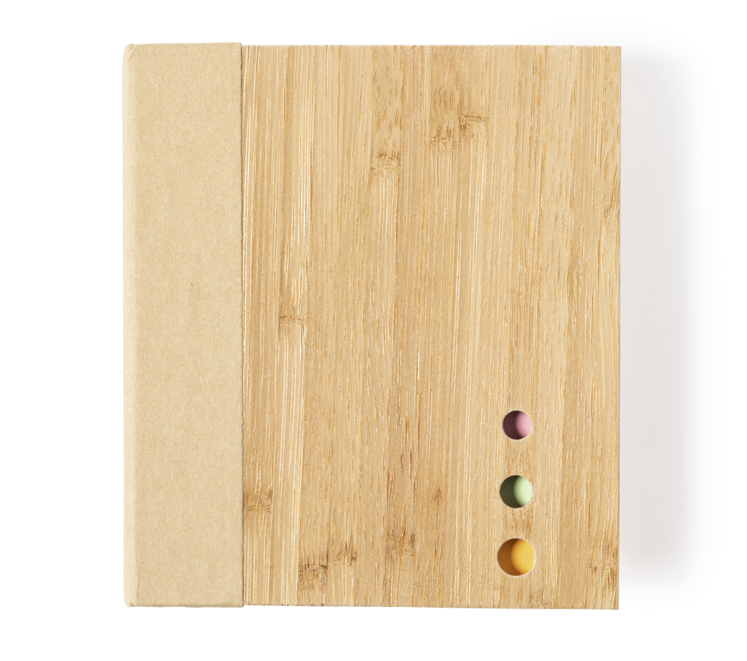 Portanotas de linea nature con tapas rígidas de bambú. Con 115 hojas adhesivas de acabado kraft, 115 hojas adhesivas medianas y 420 mini notas adhesivas.