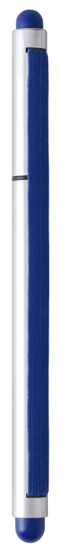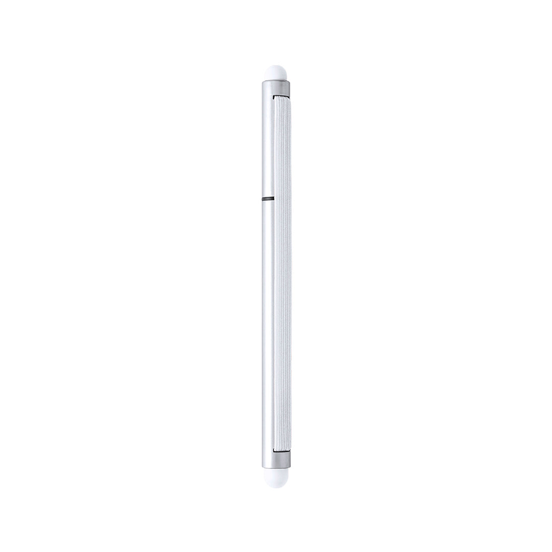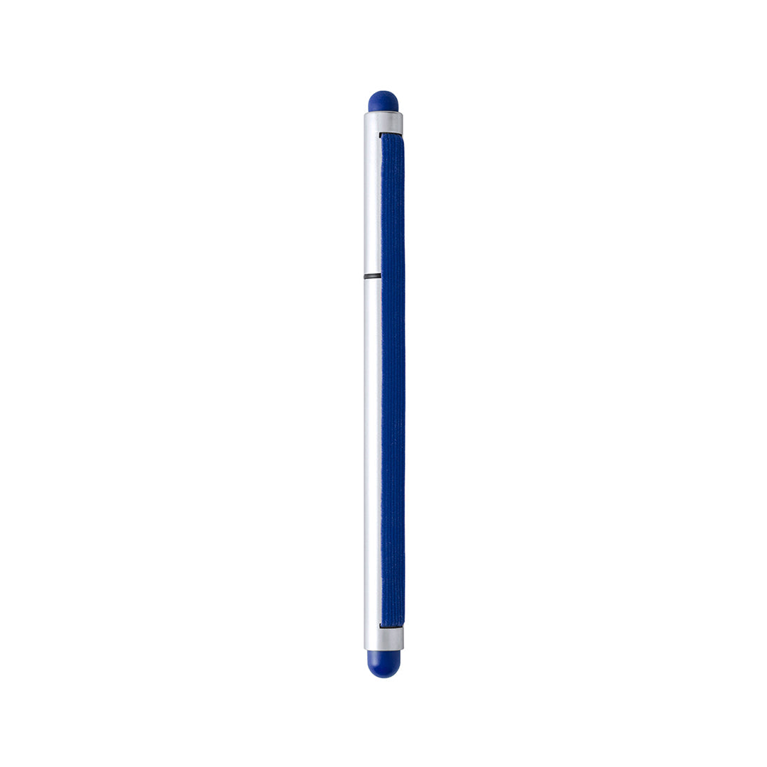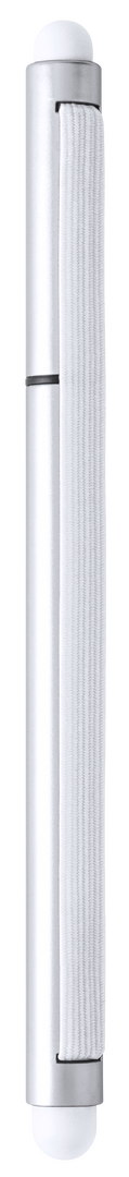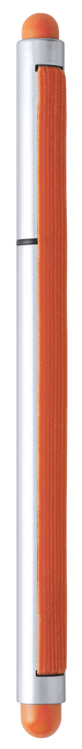 Original bolígrafo con doble puntero y cinta elástica de unión entre cuerpo y capucha. De original diseño bicolor y cuerpo de suave acabado en color plateado, está especialmente diseñado como complemento para bloc de notas o dispositivos móviles gracias a su práctico sistema de fijación.