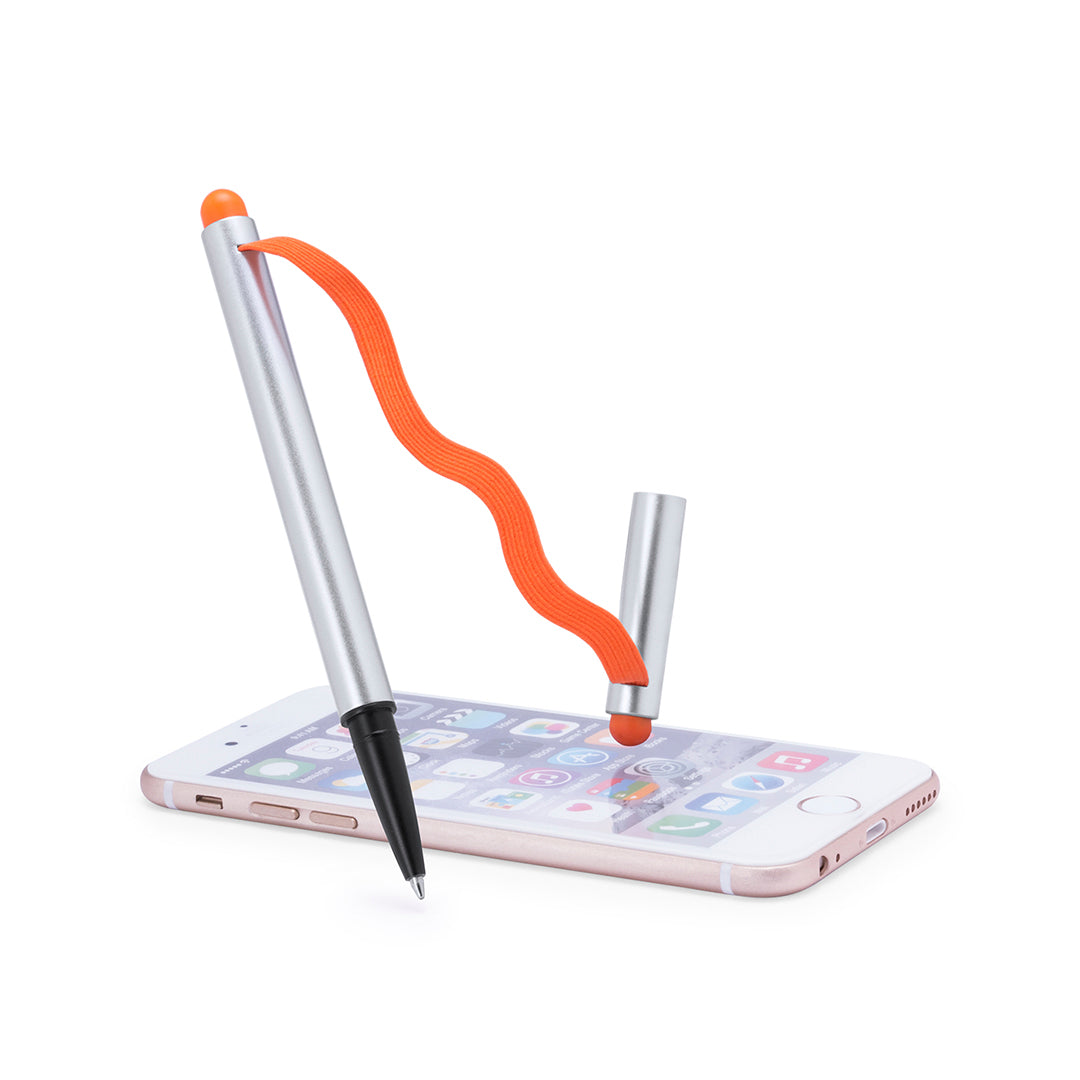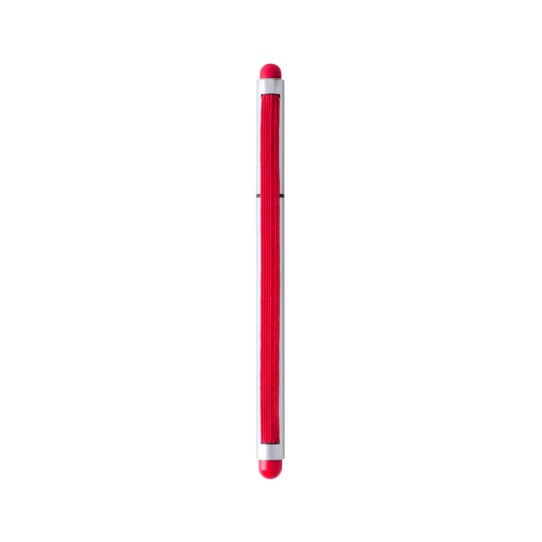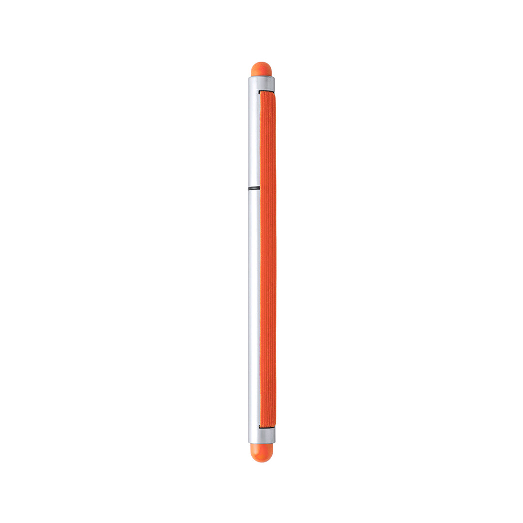 Original bolígrafo con doble puntero y cinta elástica de unión entre cuerpo y capucha. De original diseño bicolor y cuerpo de suave acabado en color plateado, está especialmente diseñado como complemento para bloc de notas o dispositivos móviles gracias a su práctico sistema de fijación.