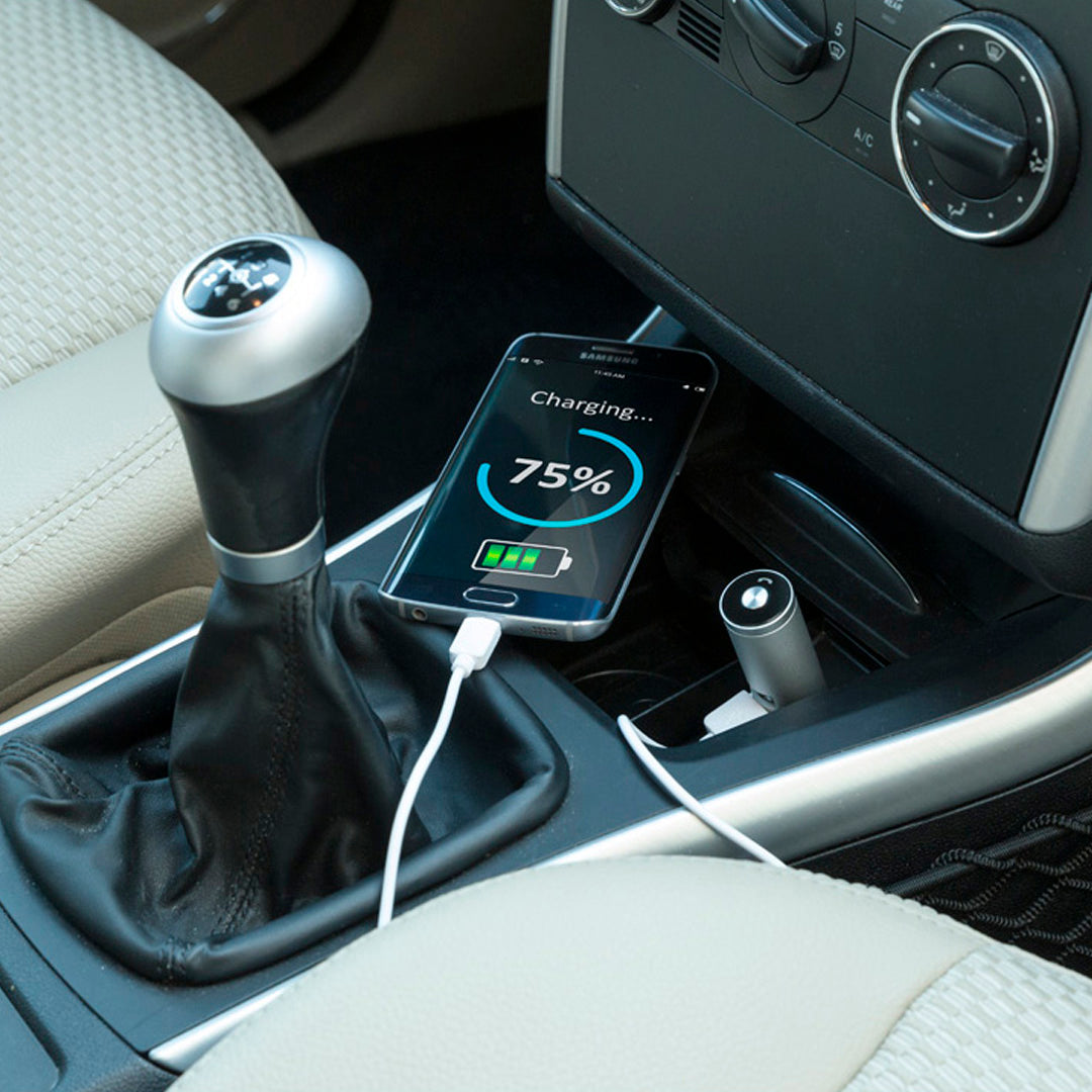 Cargador USB de aluminio para mechero de coche. De 2.100 mAh de capacidad de carga. Auricular Bluetooth manos libres integrado con panel de control, con tecnología de conexión simultánea a varios dispositivos. Salida USB dual que permite la carga simultánea de dos dispositivos móviles y sistema de fijación magnético para auricular. Tapa translúcida con led indicador de carga y presentado en caja individual.