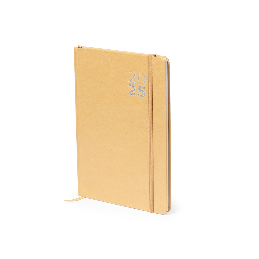 Agenda de tamaño A5 en cartón reciclado. Con cubiertas rígidas y elástico de cierre.Diseño semana vista, zona de anotaciones y marcapáginas de tela. En 2 idiomas: castellano e inglés. Presentada en caja kraft. El cartón reciclado proviene del reaprovechamiento de excedente de fabricaciones y reciclaje de papel en el final de su vida útil, convirtiéndose en un lienzo ecológico y sostenible.