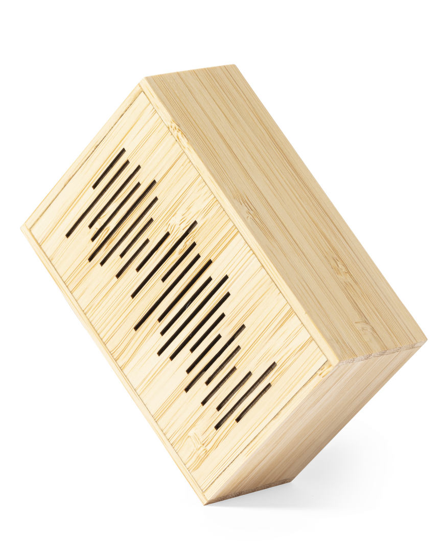 Altavoz solar de línea nature, fabricado en bambú procedente de bosques sostenibles con certificación FSCTM. Recargable mediante paneles solares integrados o por cable USB. Conexión Bluetooth, con 3W de potencia. Presentado en caja individual de diseño eco en cartón kraft.