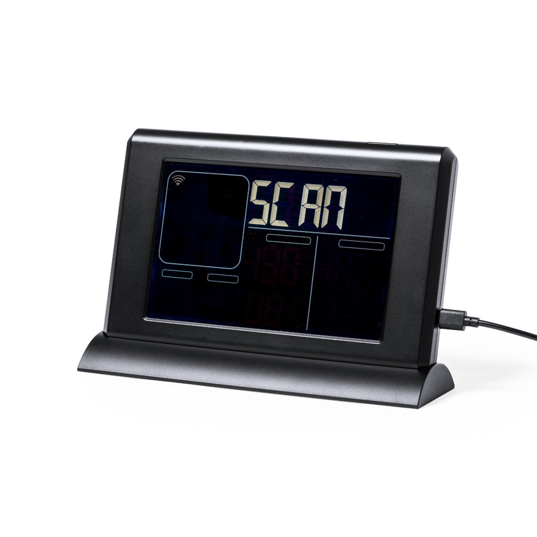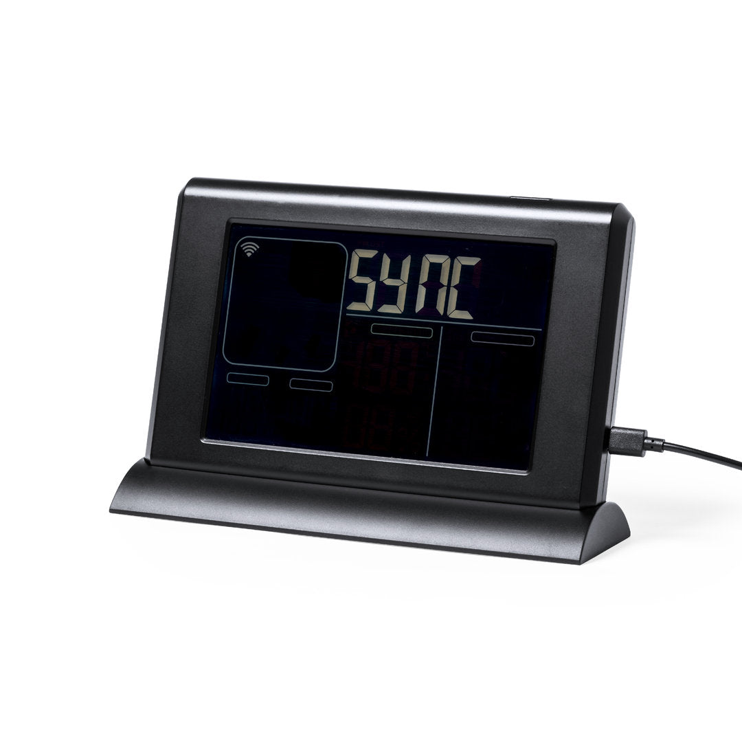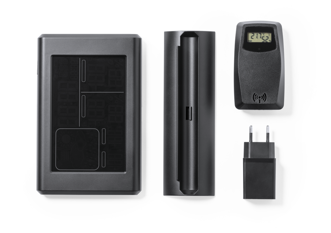 Estación meteorológica premium multifunción, fabricada en resistente ABS de acabado negro satinado. Incluye pantalla retroiluminada, de fácil lectura y con gráficos en color. Con sensor inalámbrico para temperatura/humedad exterior y sensor integrado para temperatura/humedad interior. Funciones alarma y calendario, con APP disponible -compatible con iOS/ Android- para control remoto a través de red WiFi y funciones extra. Adaptador de corriente y cable USB incluido de 1 m de largo, con soporte para montaje en la pared. Sensor externo con alimentación a pilas (2xAAA no incluidas). Presentación en caja individual de diseño kraft, con manual de instrucciones en español e inglés.