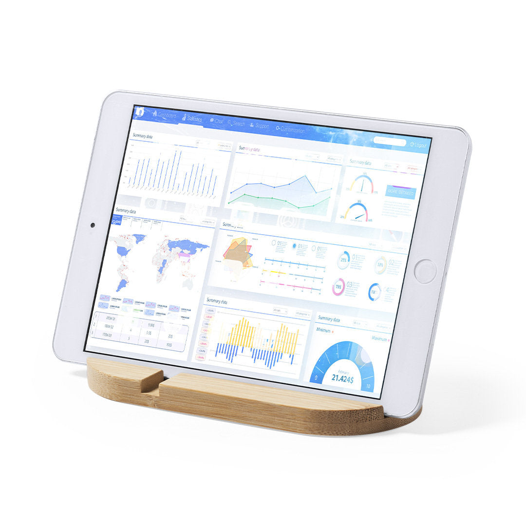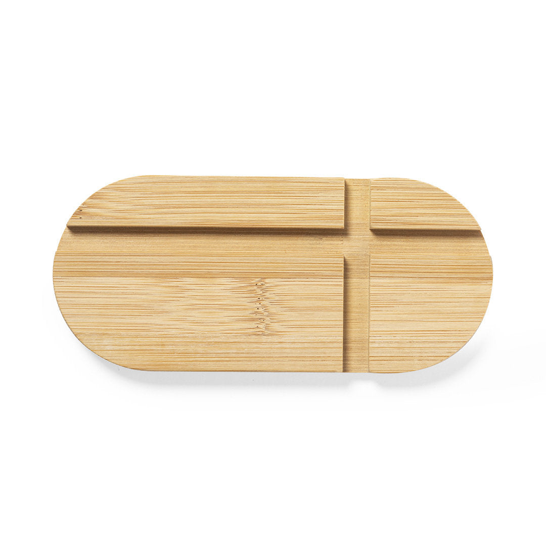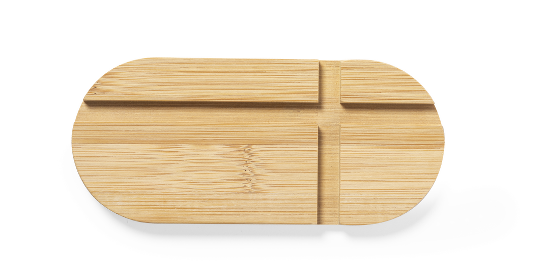Original y sencillo soporte de línea nature para smartphone y tablet. Fabricado en bambú procedente de cortes naturales. Presentado en atractiva caja individual de diseño eco.