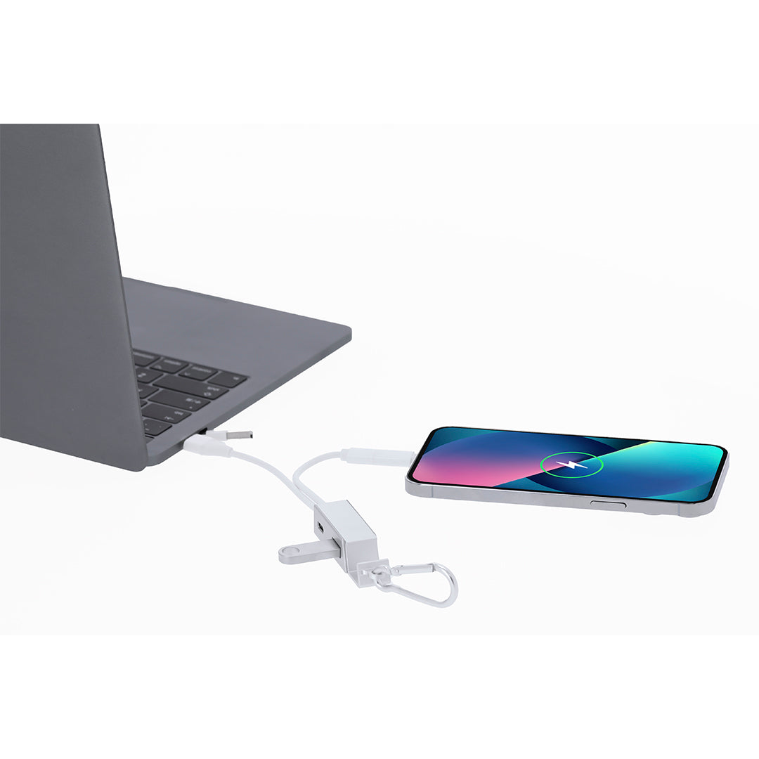 Puerto USB cargador con soporte fabricado en Aluminio Reciclado. Incluye dos conexiones output dual Tipo C/USB y tipo C/Lightning, y dos conexiones input tipo C y USB.Con mosquetón para fácil transporte.Con distintivo de Aluminio Reciclado. El aluminio reciclado es un material con posibilidades de reciclaje casi infinitas, sin perder sus propiedades originales y consumiendo menos energía en este proceso.Certificación GRS (Global Recycled Standard / Estándar de Reciclaje Global), que garantiza el origen reciclado del material usado para fabricar el producto.