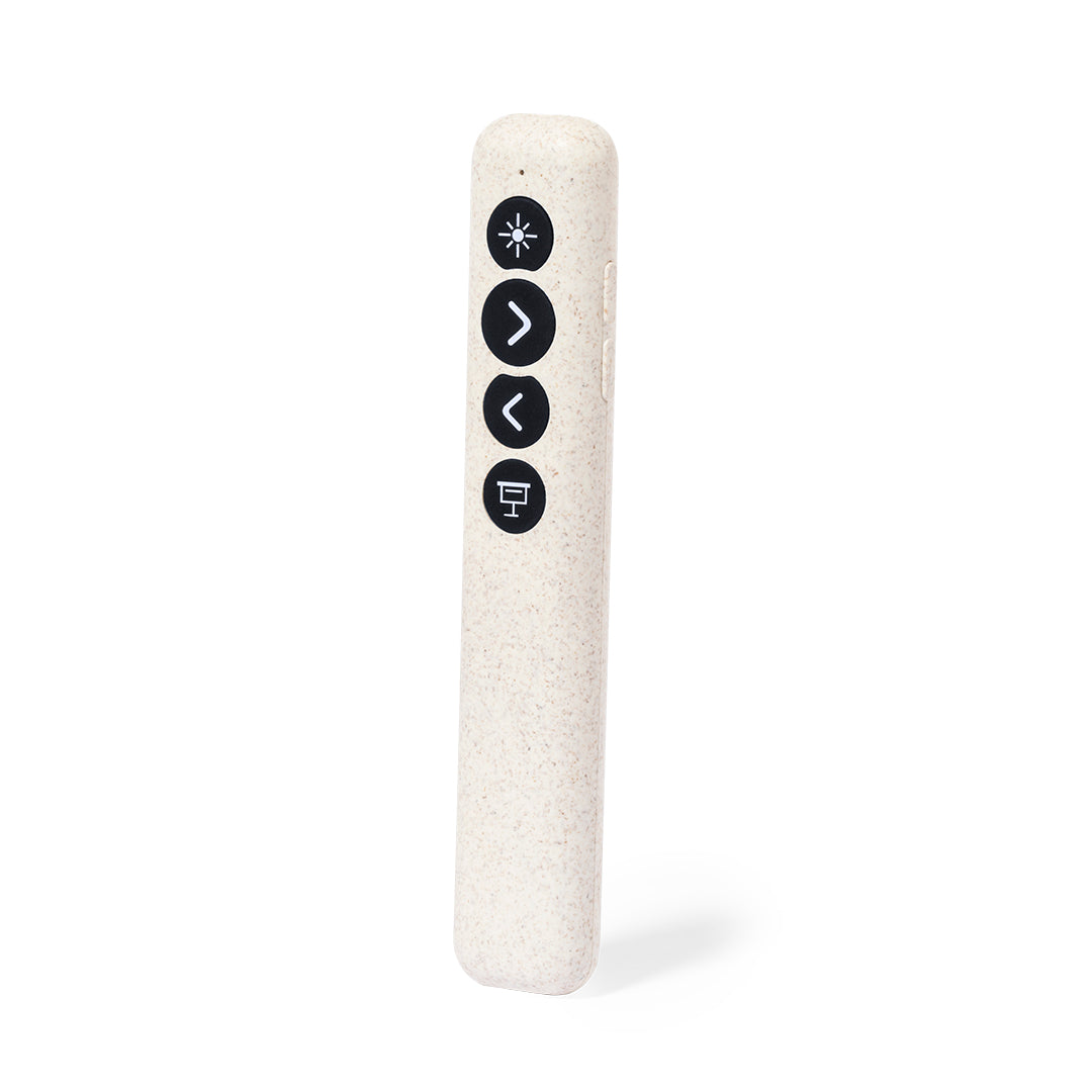Elegante puntero láser de clase 2 con conexión USB fabricado en caña de trigo. Especialmente diseñado para presentaciones PowerPoint y Keynote, incorpora pulsador de activación lateral, con botones de avance, pausa y retroceso. Con cuerpo especialmente diseñado para marcaje en tampografía. Alimentación a pilas: 1xAAA incluida. Presentado en caja de diseño kraft, con manual de instrucciones en español e inglés.La caña de trigo fomenta la utilización de materias primas naturales, reduciendo así las emisiones contaminantes.