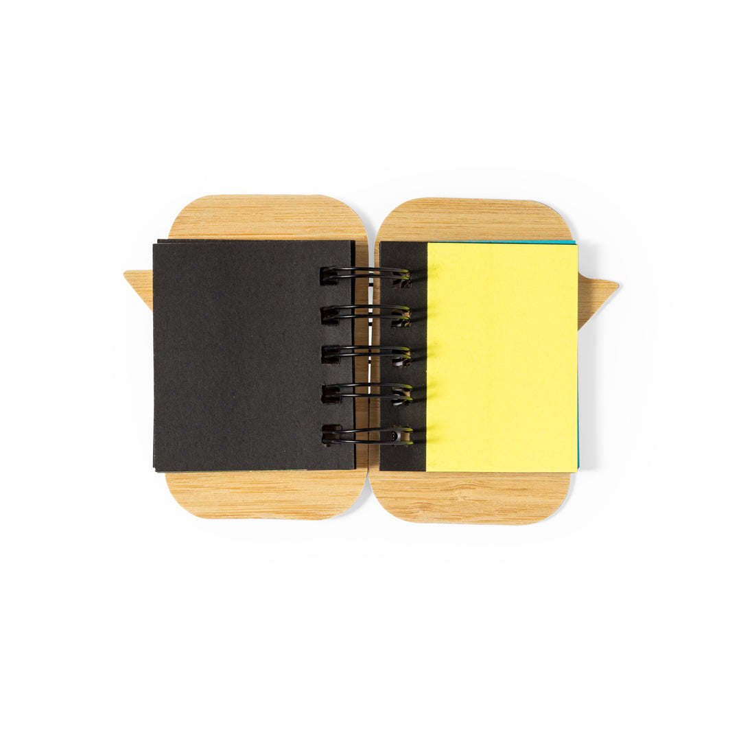 Bloc de notas con anillas y de tapas rígidas elaboradas con bambú en forma de globo speech. Interior con 25 notas adhesivas de 5x7,5cm y 125 mininotas adhesivas de 1,5x5cm en variados colores. Presentado en bolsa individual reciclada.Materiales como el bambú fomentan la utilización de materias primas naturales, reduciendo las emisiones contaminantes. Proviene de una planta de gran resistencia y versatilidad, con crecimiento y regeneración rápidos, siendo una excelente alternativa al uso de madera tradicional.