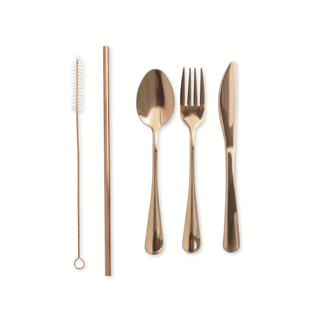 Set de cubiertos de 5 piezas fabricados en acero inox con recubrimiento exterior de cobre galvanizado. Incluye cuchara, tenedor, cuchillo, pajita reutilizable y cepillo limpiador para la pajita. Presentación en funda de antelina negra con cordón de cierre.