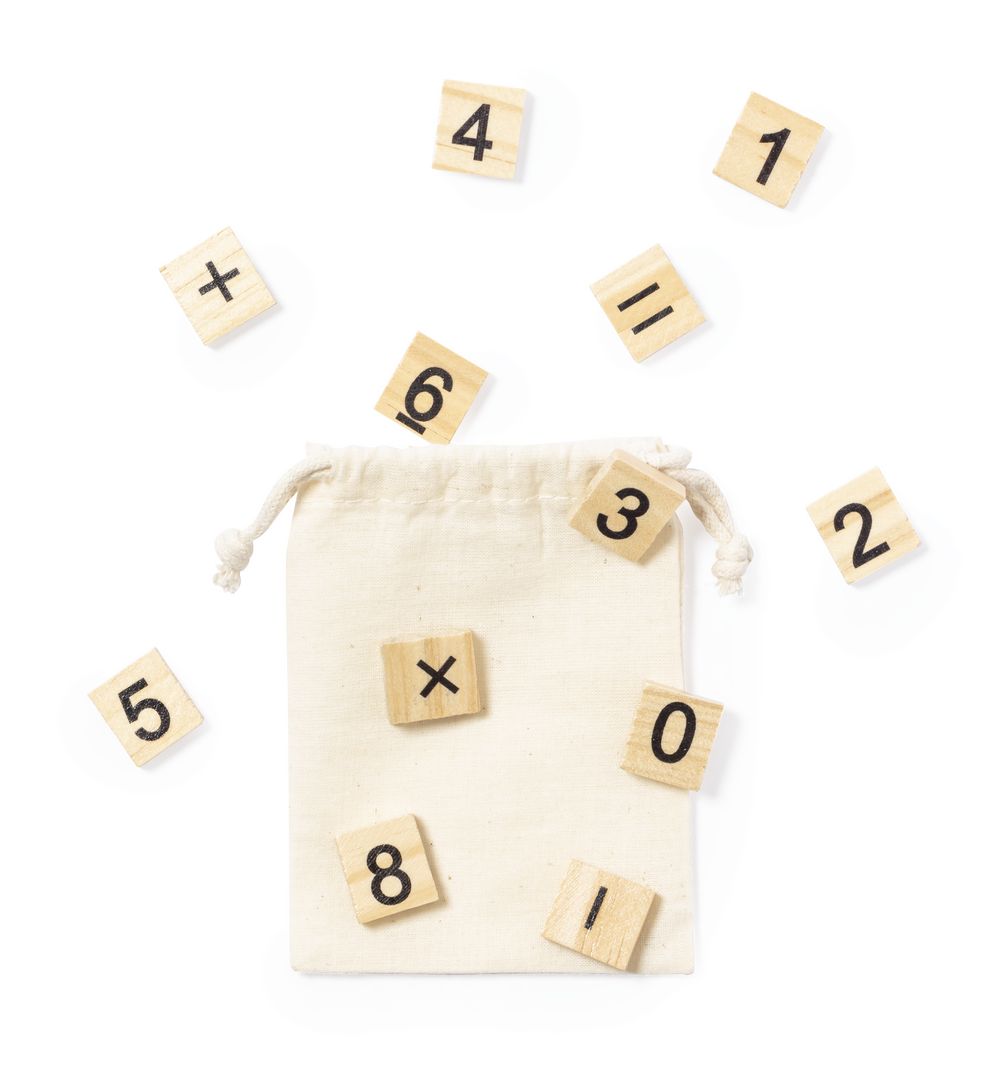 Juego de calculo fabricado en resistente madera natural de pino. Set de 32 piezas en bolsa de transporte 100% algodón con cordones de cierre a juego.