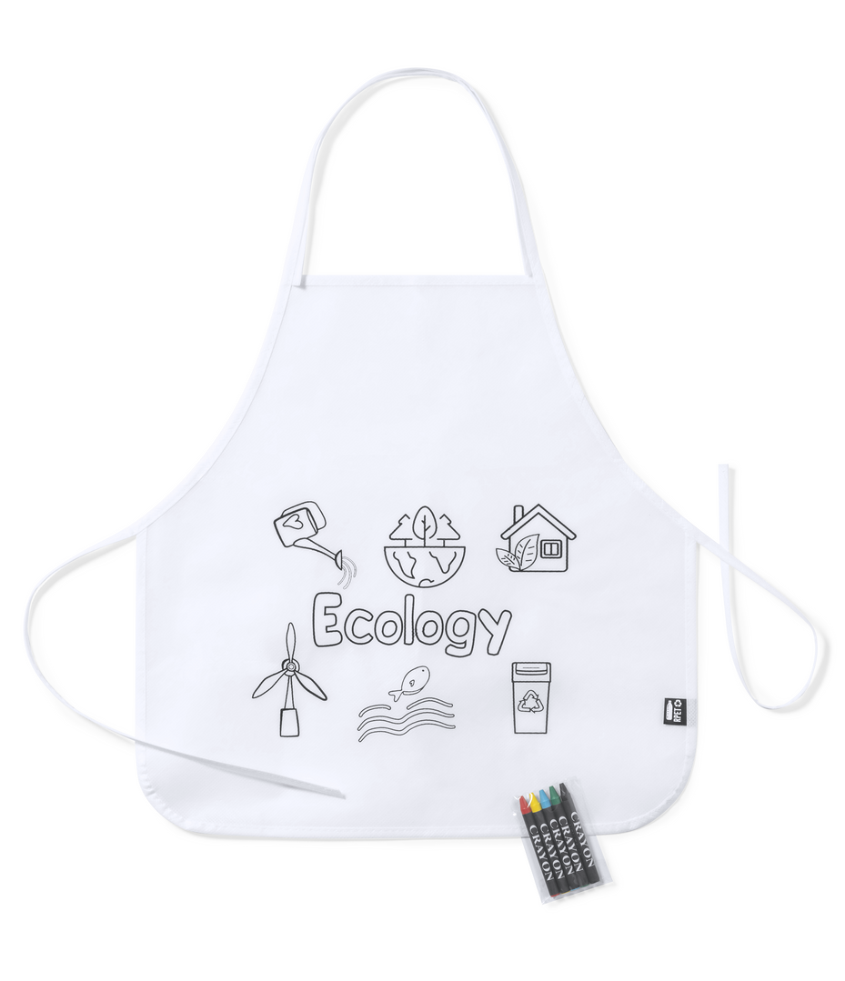 Delantal fabricado en non-woven RPET de color blanco, especialmente diseñado para colorear con ceras. Incluye 5 ceras en variados colores. Con cintas de ajuste en cuello y cintura. Distintivo RPET en etiqueta exterior.El material RPET se elabora a partir de plástico reciclado, para así fomentar la reutilización de residuos plásticos y ayudar a la sostenibilidad del planeta.