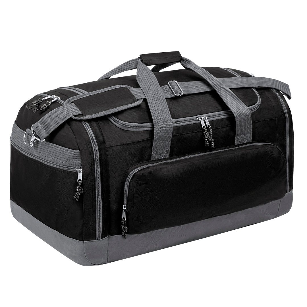 Bolso multiusos de gran capacidad en resistente poliéster 600D. De diseño bicolor, con base y detalles en color gris. Compartimento principal y bolsillos laterales con cierre de cremallera. Resistentes asas de transporte en nylon, con cierre de velcro a juego. Incluye cinta bandolera ajustable con cierre mosquetón y almohadilla de protección para el hombro a juego. Base reforzada.