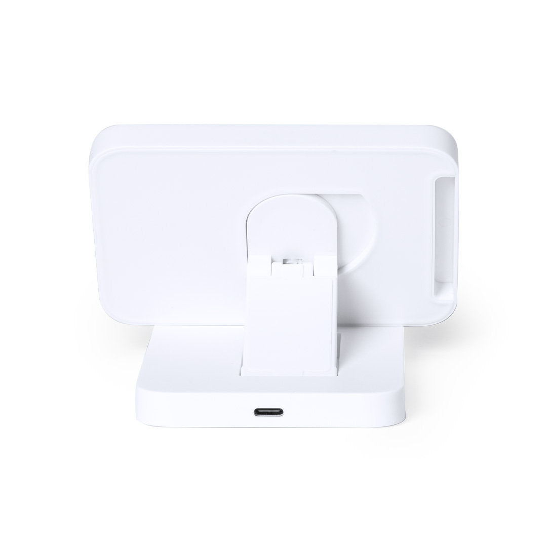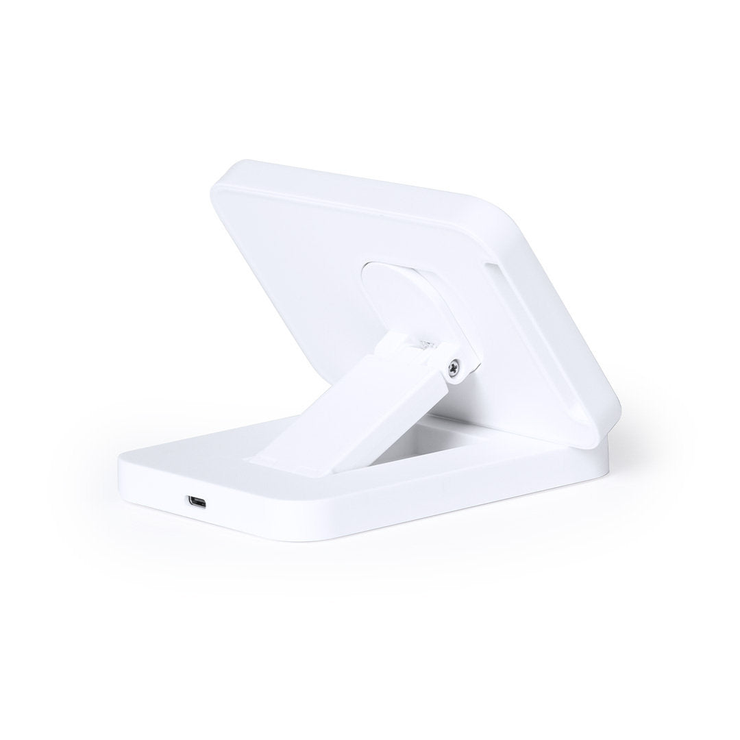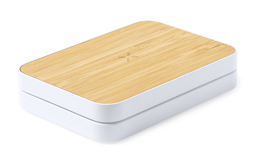 Cargador inalámbrico plegable 15W. Con base fabricada en resistente ABS de color blanco y superficie de carga en bambú, con soporte telescópico integrado. Compatible con dispositivos equipados con tecnología de carga inalámbrica Qi, con cable de carga Tipo C incluido. Presentado en caja individual de diseño kraft, con manual de instrucciones en español e inglés. Fabricado conforme a los estándares RoHS y en cumplimiento con los siguientes requisitos de seguridad: Sistema de protección contra sobrecalentamiento. Sistema de protección contra sobrecarga. Sistema de bloqueo para evitar cortocircuitos.