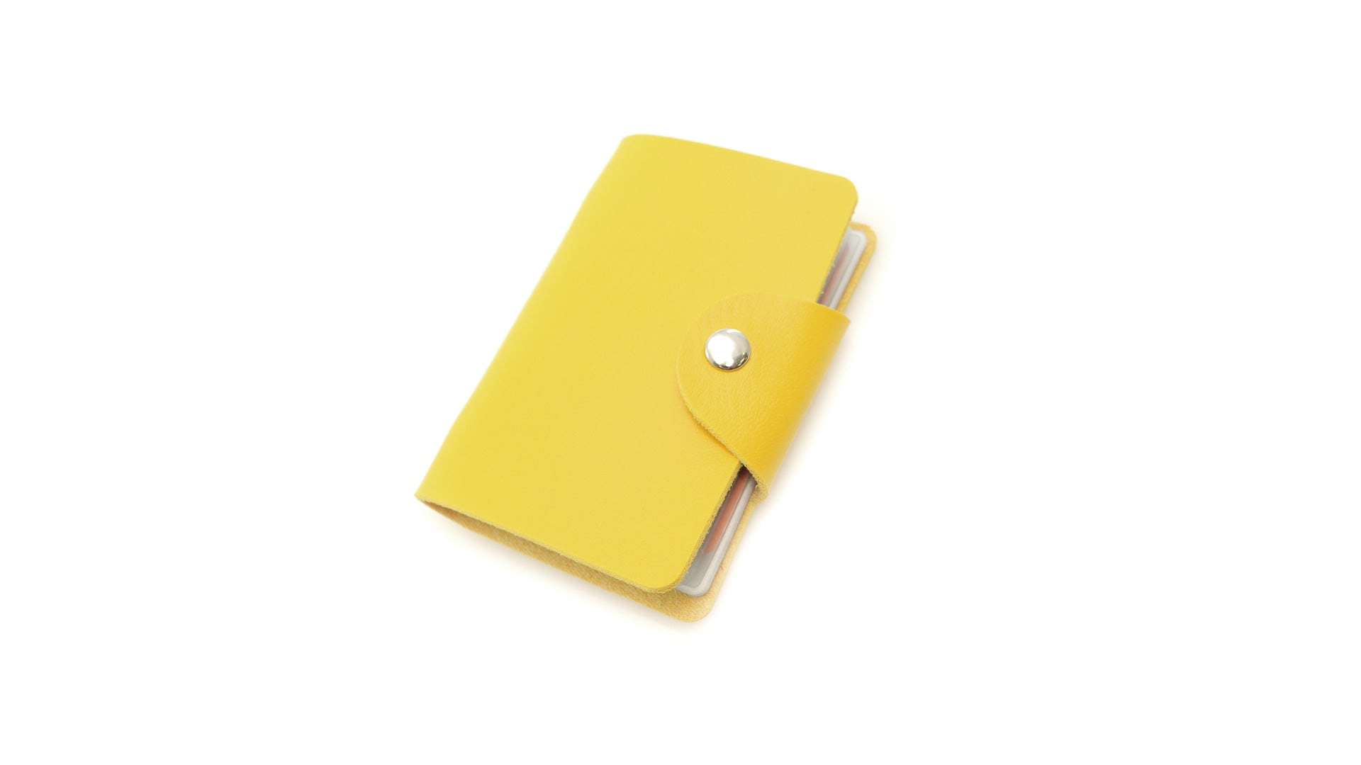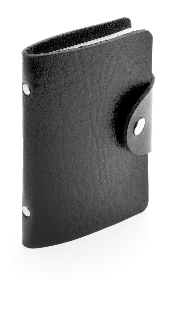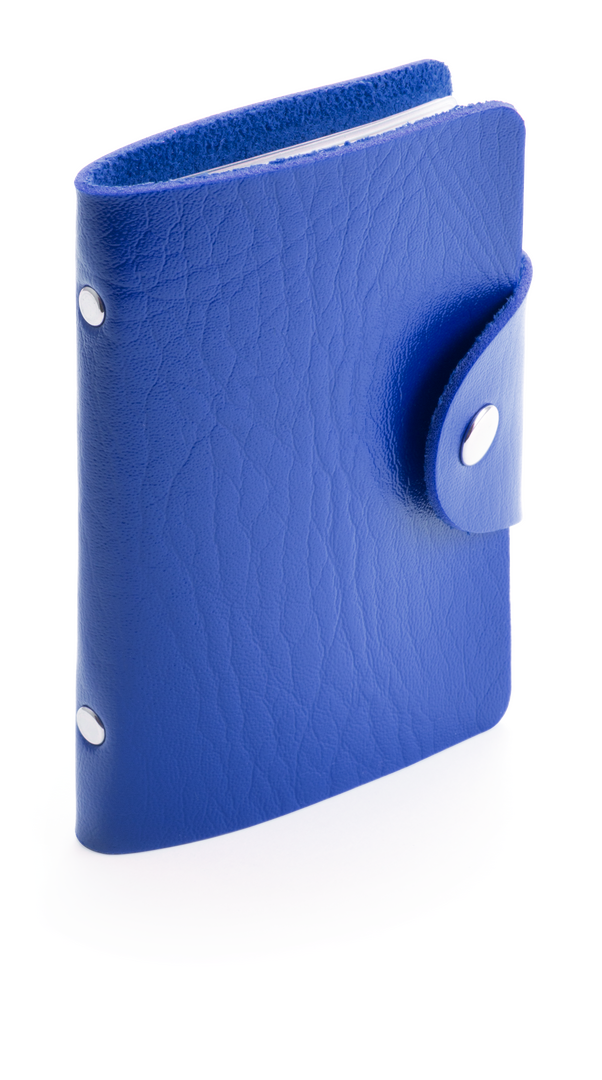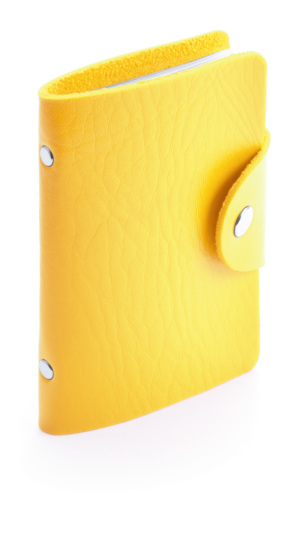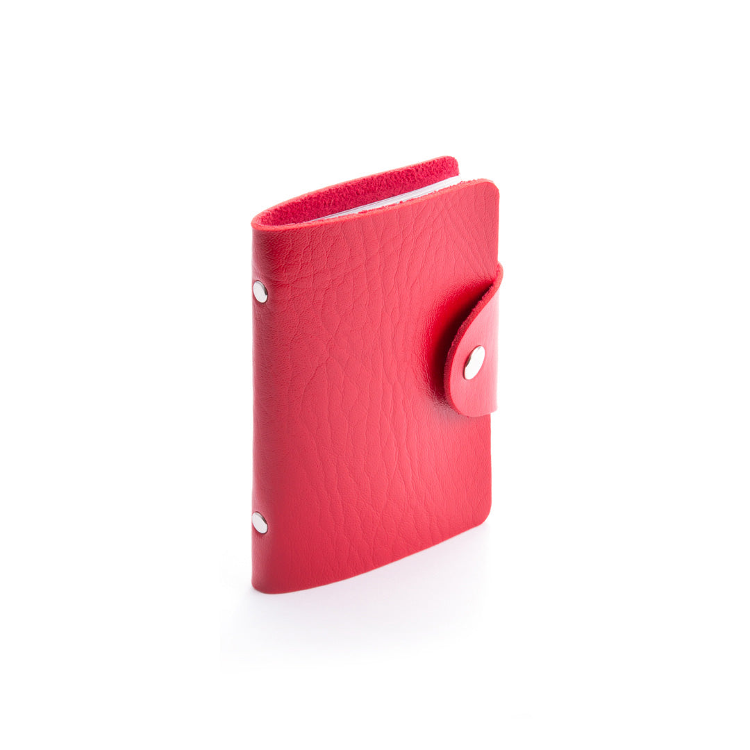 Tarjetero con cuerpo en suave acabado en polipiel de llamativos colores y cierre de corchete metálico. Con tachuelas de refuerzo metálicas en el lomo y 10 compartimentos interiores en resistente PVC transparente.