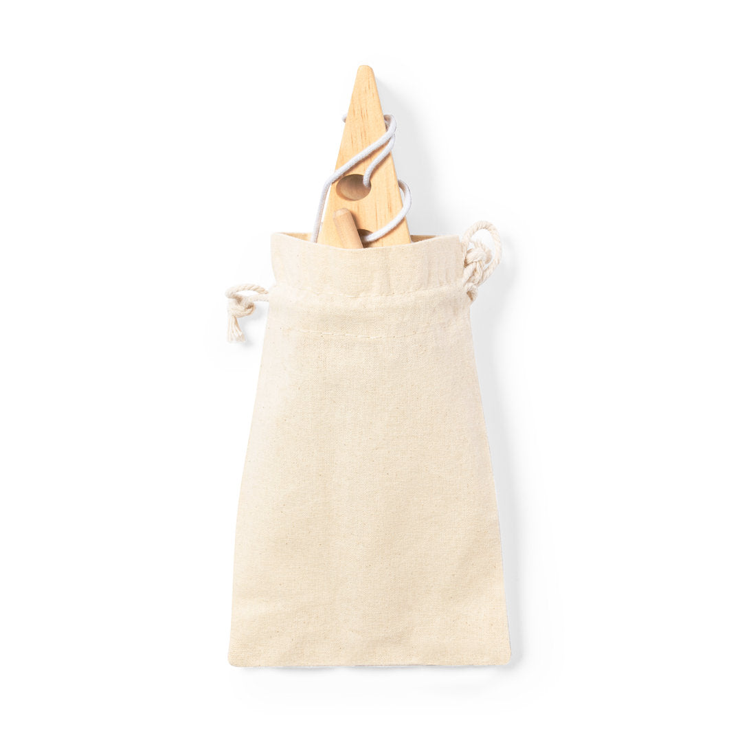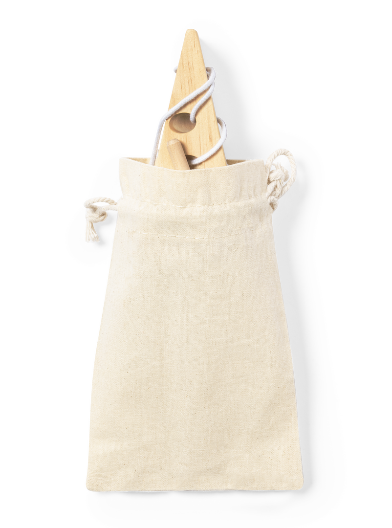 Juego de habilidad fabricado en resistente madera de pino natural y en bolsa de transporte 100% algodón con cordones de cierre.