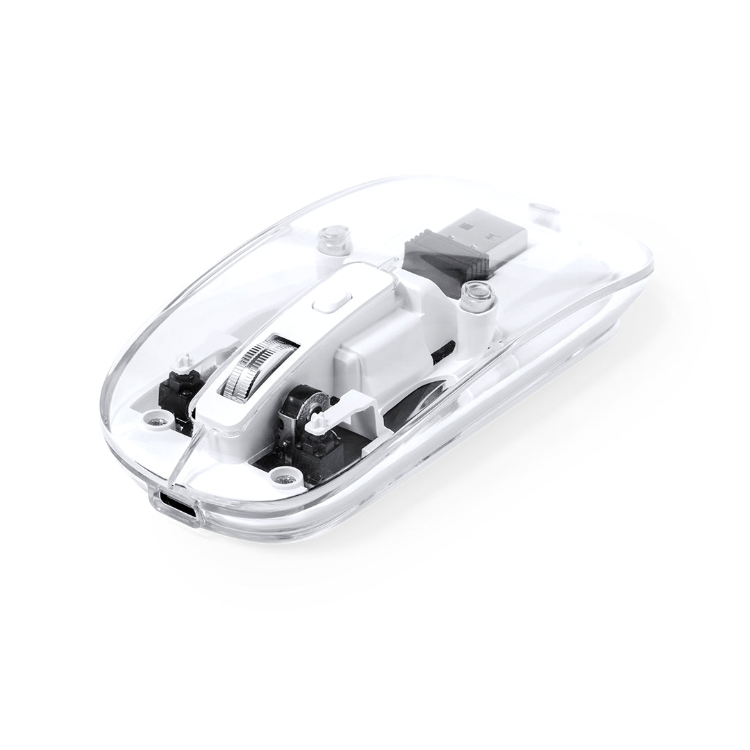 Ratón óptico inalámbrico de original diseño, con cuerpo transparente que permite ver los componentes internos del dispositivo. Con batería integrada de 300 mAh y con puerto de carga Tipo C (cable incluido). Incluye botón DPI, con conexión “plug and play” por USB y viene presentado en caja individual de diseño kraft.