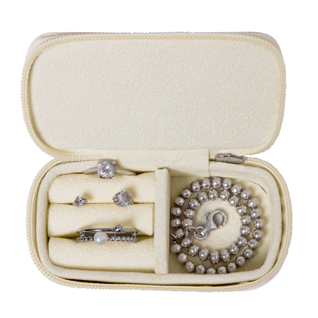 Estuche joyero fabricado en polipiel. Diseño de color natural con cierre de cremallera y dos compartimentos en su interior. Un compartimento en forma de cajita y otro compartimento con almohadillas para sujetar anillos y pendientes, forrado de suave tela. Presentado en una bolsa de papel individual.
