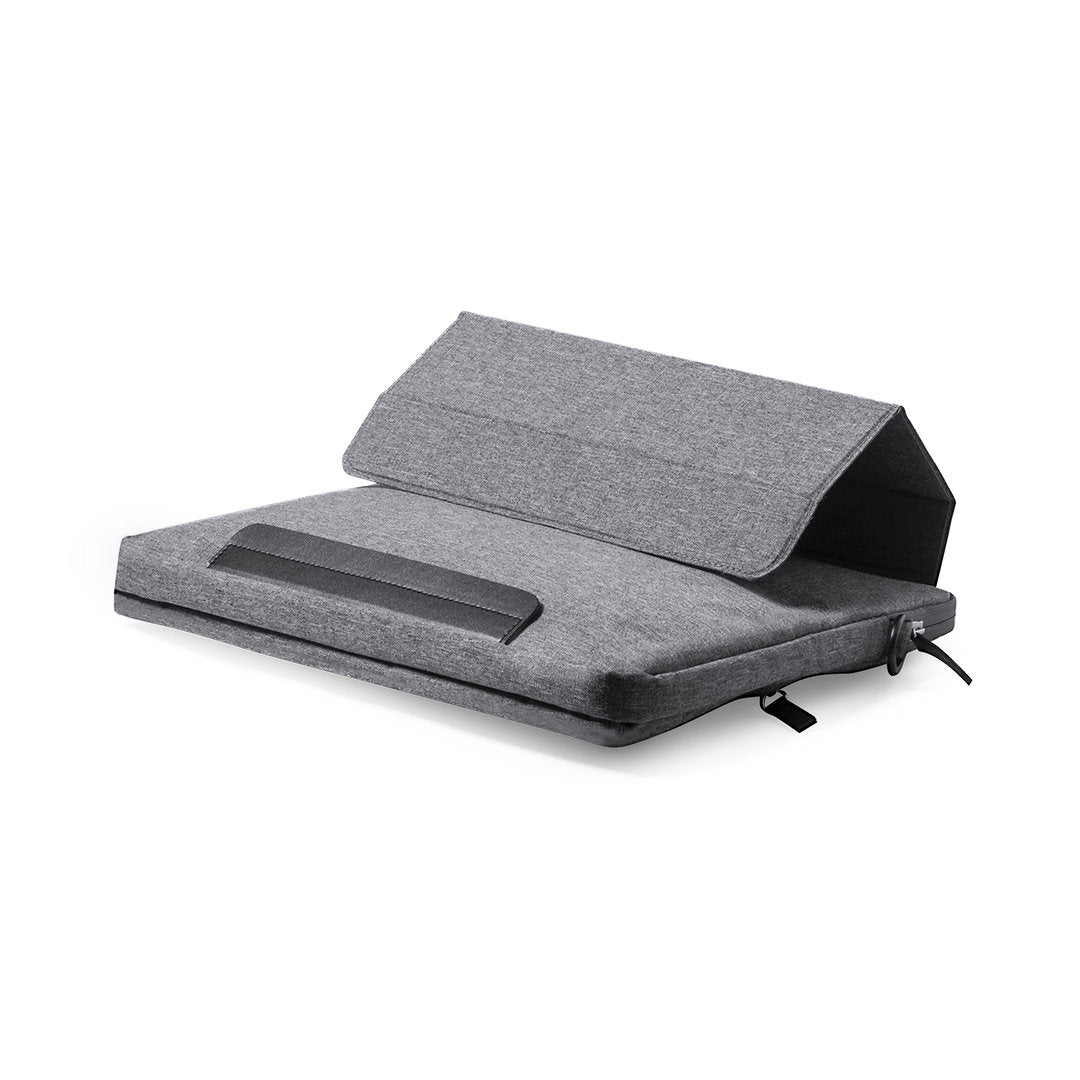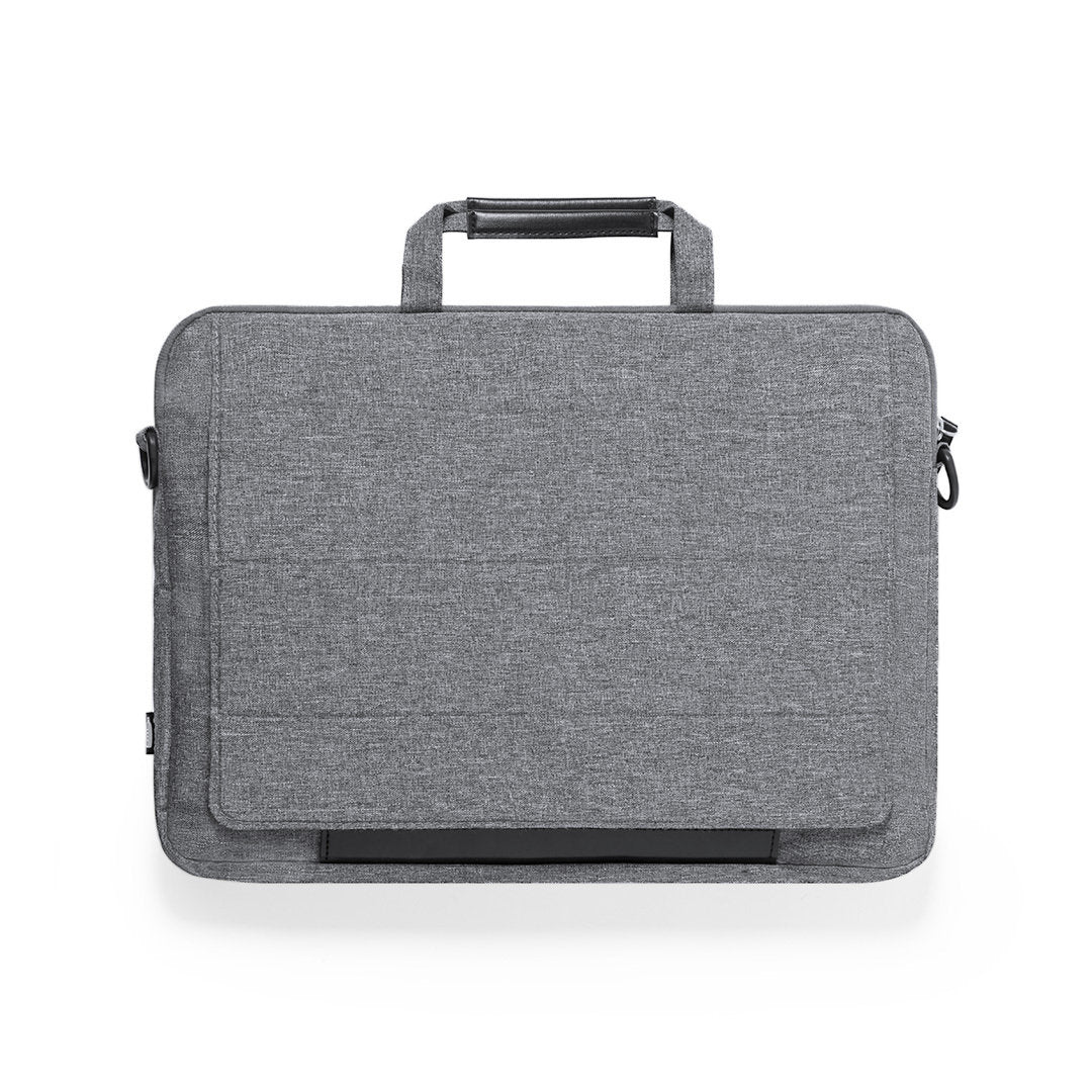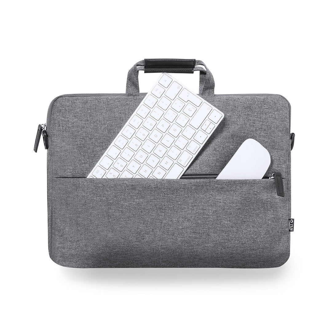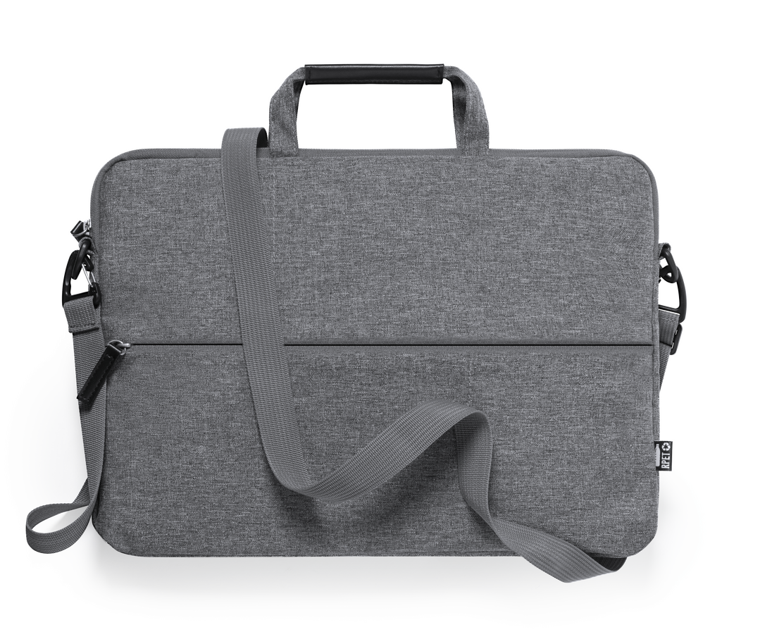 Portadocumentos de línea nature y en resistente 300D RPET efecto melange, elaborado a partir de plástico reciclado, para así fomentar la reutilización de residuos plásticos y contribuir a la sostenibilidad del planeta. Con original soporte integrado para ordenador portátil, bolsillos principal y frontal con cierre de cremallera. Interior con bolsillo acolchado para portátil de hasta 15 pulgadas y bolsillo para tablet de hasta 10 pulgadas. Cinta bandolera ajustable para hombro, con asa de transporte reforzada. Resistencia hasta 6kg, con distintivo RPET en etiqueta exterior.