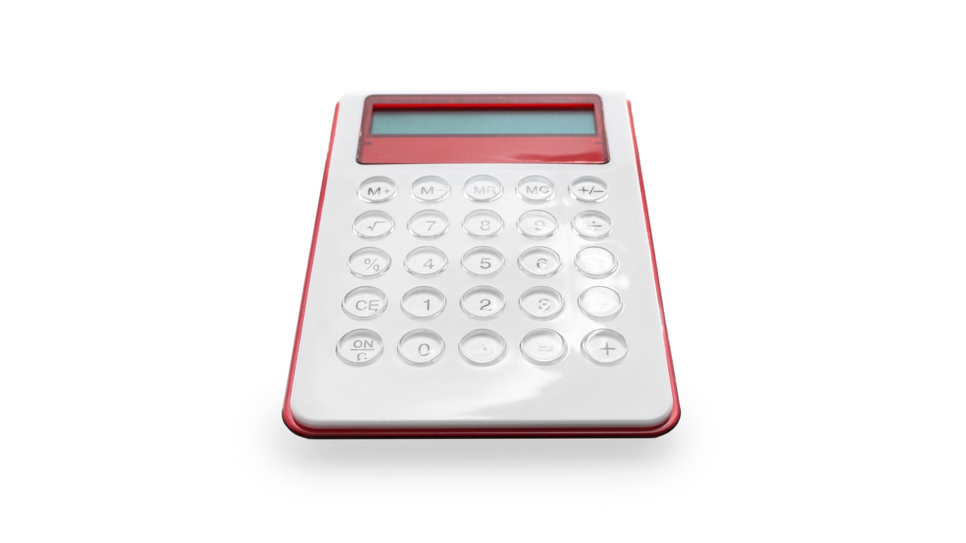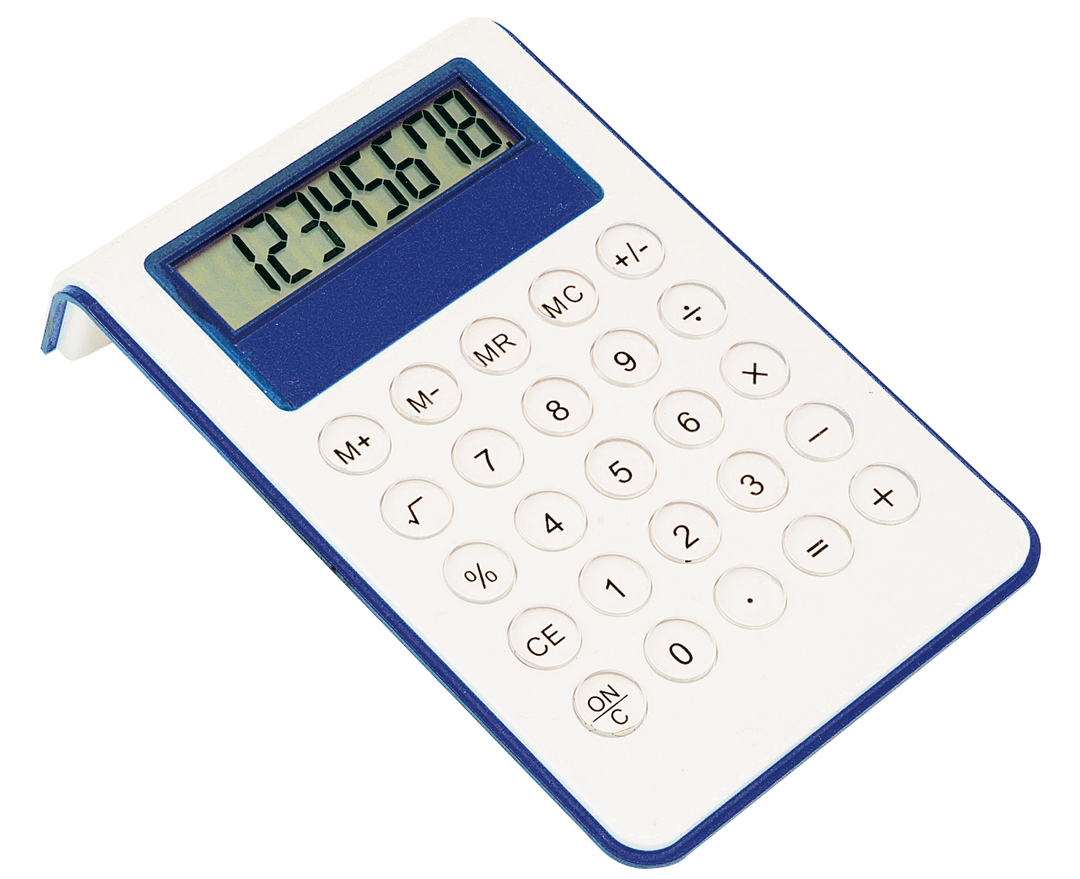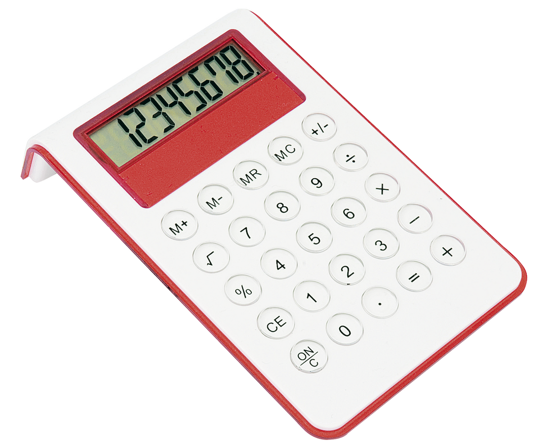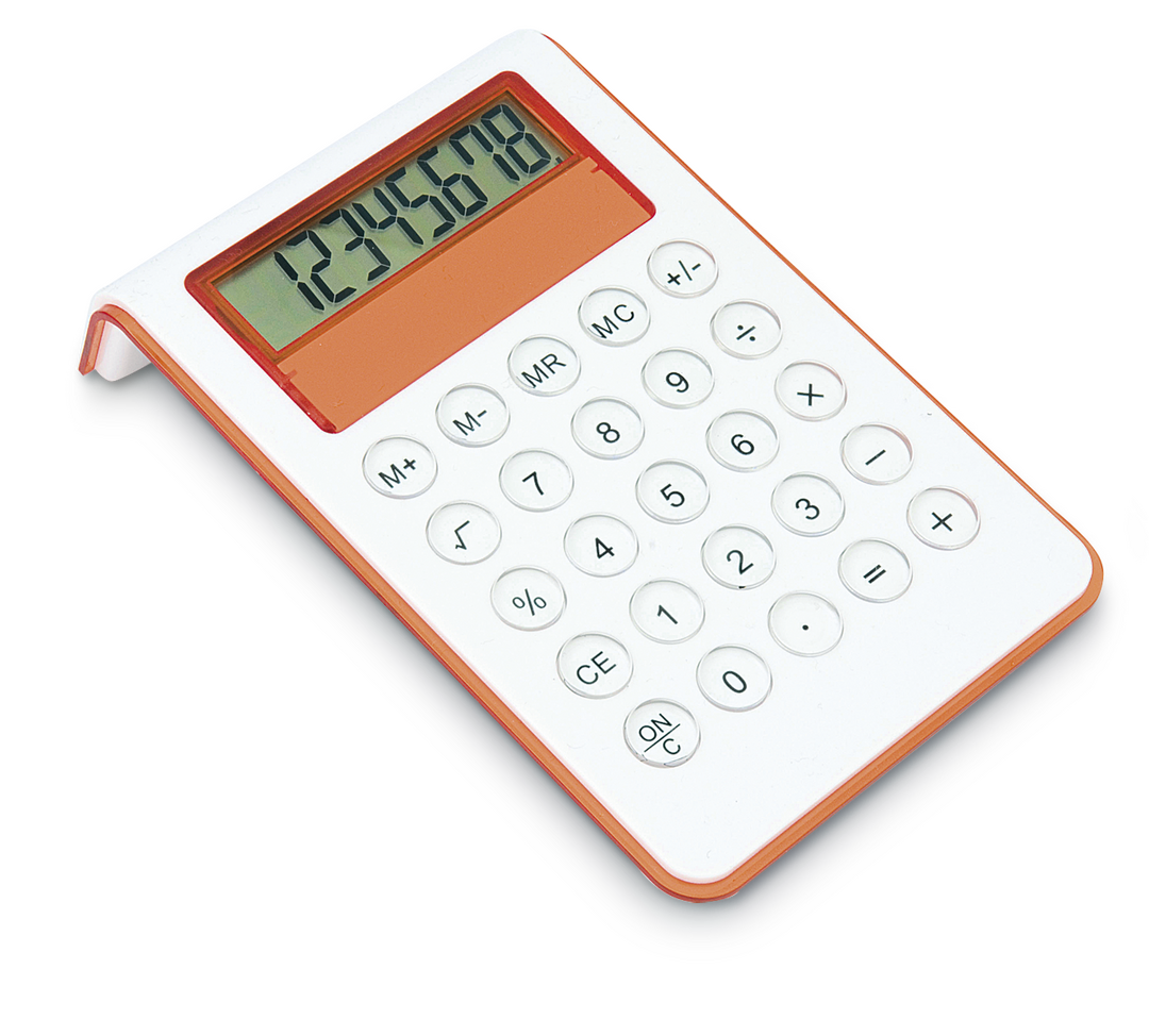 Calculadora de 8 dígitos en original diseño bicolor de vivos colores y con suaves teclas transparentes. Pila de botón incluida con film protector y presentada en caja individual.