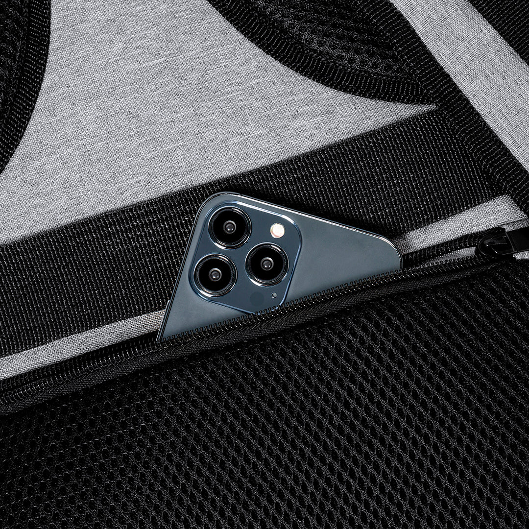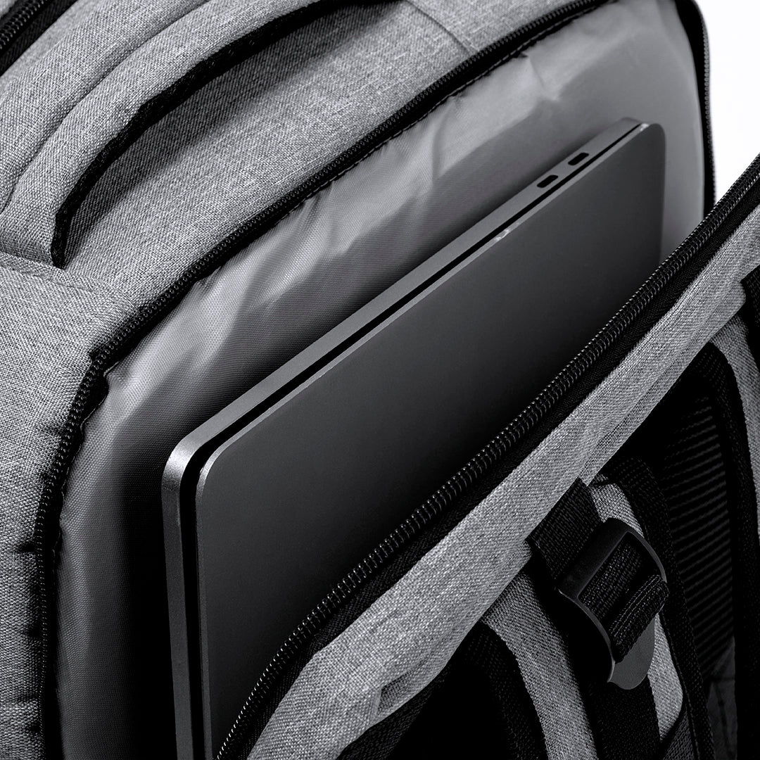 Mochila multifunción fabricada en 300D RPET. Elaborada con poliéster reciclado y resistente al agua, cuenta con una excelente transpirabilidad en la zona trasera, facilitando la disipación del calor gracias a sus cintas y respaldo acolchados. Las cintas anchas están diseñadas para aliviar la presión en los hombros, permitiendo llevar la mochila cómodamente durante largos periodos.Perfecta para cualquier situación por tener múltiples compartimentos: 2 bolsillos frontales. 3 compartimentos grandes centrales, uno de ellos portatodo, un bolsillo central de gran capacidad para guardad ropa y/o complementos con organizador en su interior, y un tercero acolchado, perfecto para llevar portátil de hasta 17,3 pulgadas. Además, cuenta con 3 apartados especiales, un bolsillo lateral perfecto para tener acceso rápido, bolsillo para calzado en la base con argollas de ventilación, y bolsillo antirrobo en la espalda, además de cable USB. Perfecta para viajes o para el día a día por sus cintas ajustables, adaptándose a todo estilo de vida. Disponible en negro y gris, con logotipo RPET incluido. Presentada individualmente en bolsa reciclada.El material RPET se elabora a partir de plástico reciclado, para así fomentar la reutilización de residuos plásticos y ayudar a la sostenibilidad del planeta.