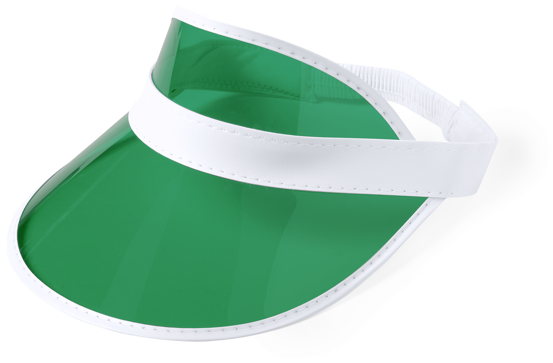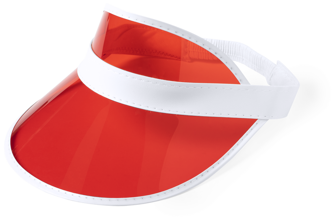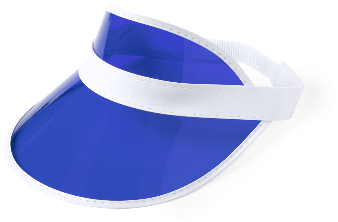 Original visera de PVC con protección UV. Acabada en colores transparentes en combinación con detalles de color blanco. Con cinta elástica ajustable y disponible en variada combinación de colores.