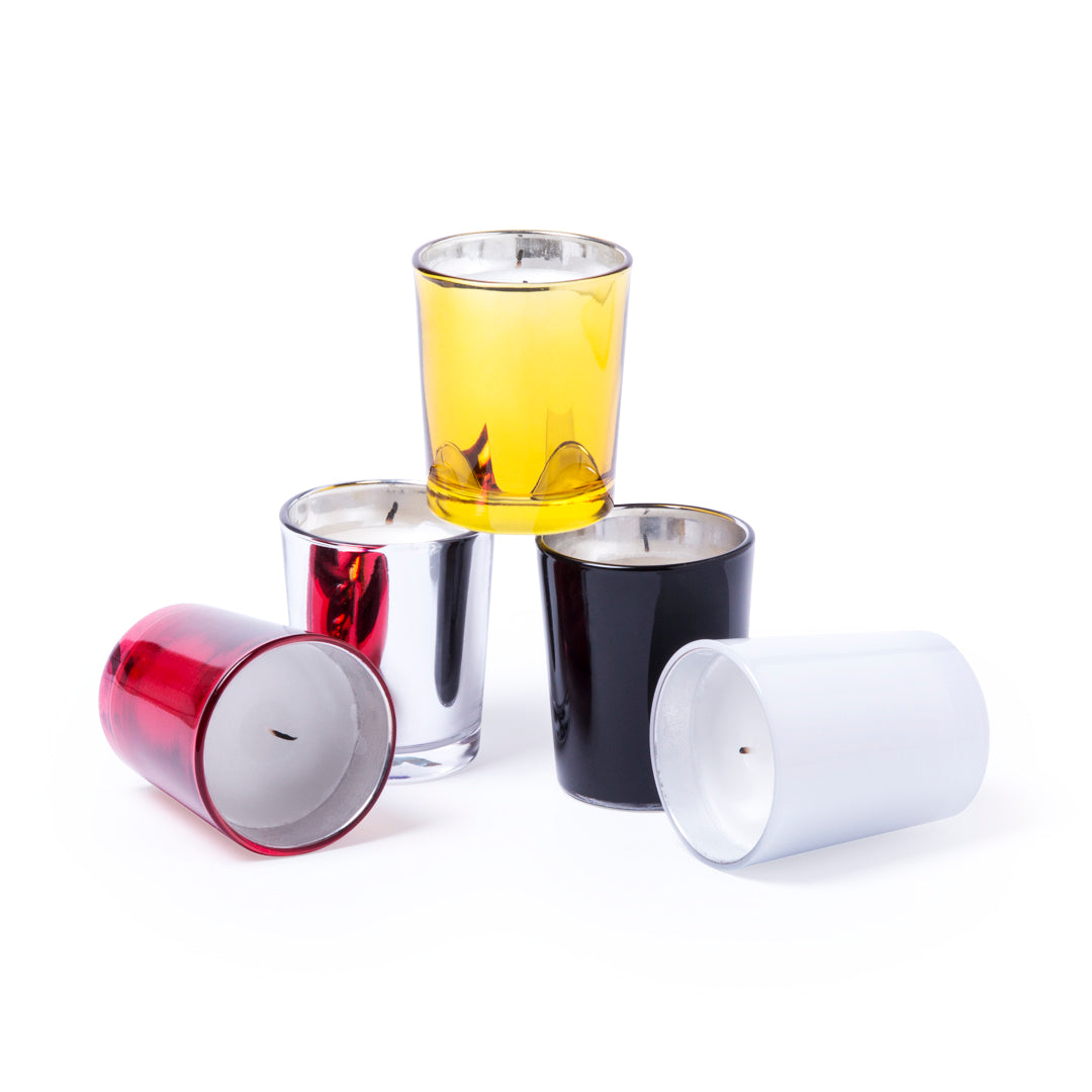 Original vela aromática en recipiente de cristal de vivos colores y variadas fragancias. Disponible en aromas café, pino, lavanda, vainilla y fresa. Presentada en caja individual.