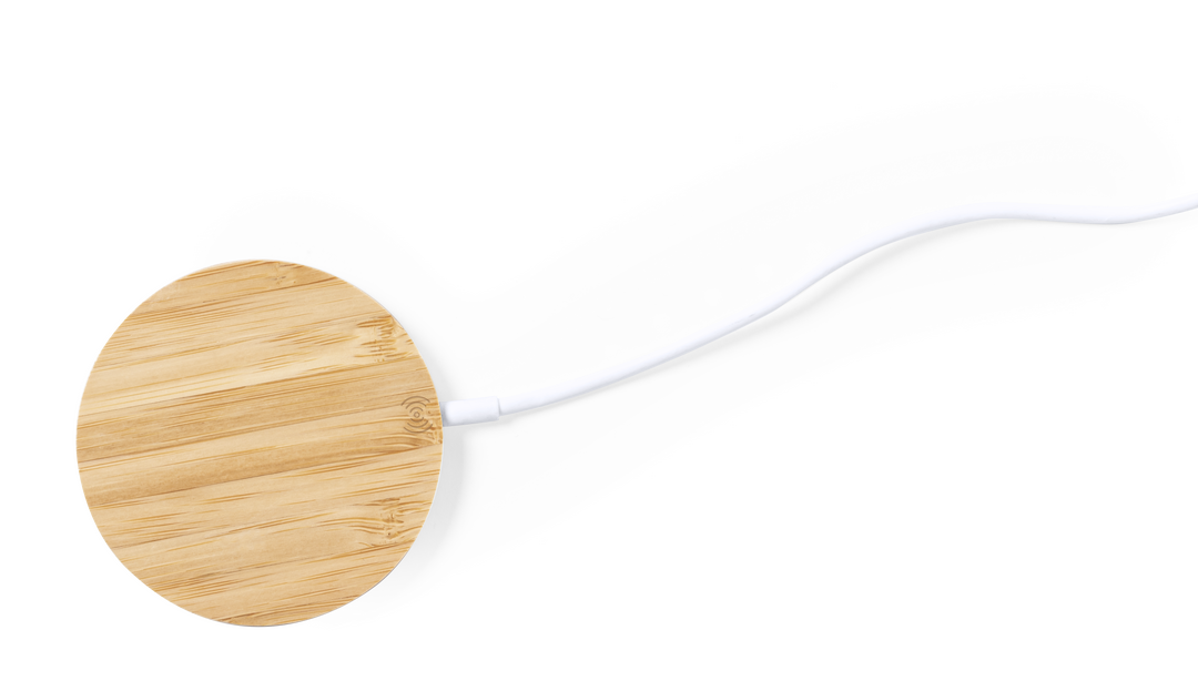 Cargador inalámbrico magnético de línea nature con función soporte para móvil. Cargador inalámbrico fabricado en bambú, y carcasa en PLA -Ácido PoliLáctico-, que se obtiene a partir de recursos 100% naturales como el almidón de maíz, la yuca o la caña de azúcar, pudiendo convertirse en 100% compostable al final de su ciclo de vida útil. Con función carga rápida de 10W y compatible con dispositivos equipados con tecnología de carga inalámbrica. Incluye anilla metálica adhesiva. Cable con conexión USB de 100 cm. Amplia superficie de marcaje, presentado en atractiva caja de diseño eco.Distintivo PLA sobre el artículo.