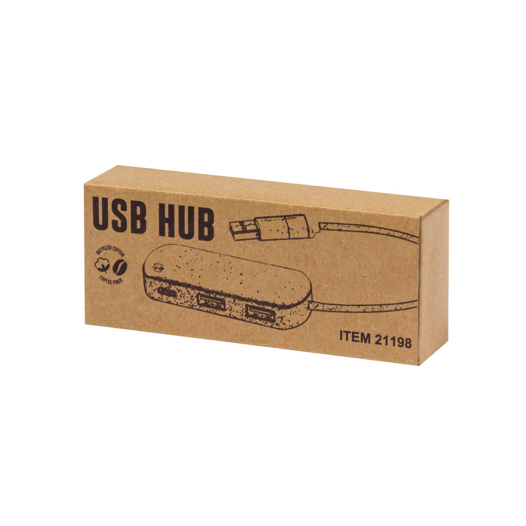Puerto USB 2.0 fabricado en fibra de café. Con conexión dual USB/Tipo C y 3 puertos: uno con conexión Tipo C y 2 puertos USB. Con logotipo fibra de café y una amplia superficie de marcaje. Presentado en caja individual de diseño kraft.La fibra de café es una solución circular que se obtiene de la utilización de los residuos producidos en la obtención del café. Una alternativa sostenible que favorece la reducción del uso de plásticos, ahorrando energía en su proceso de fabricación y contribuyendo al cuidado del medio ambiente.