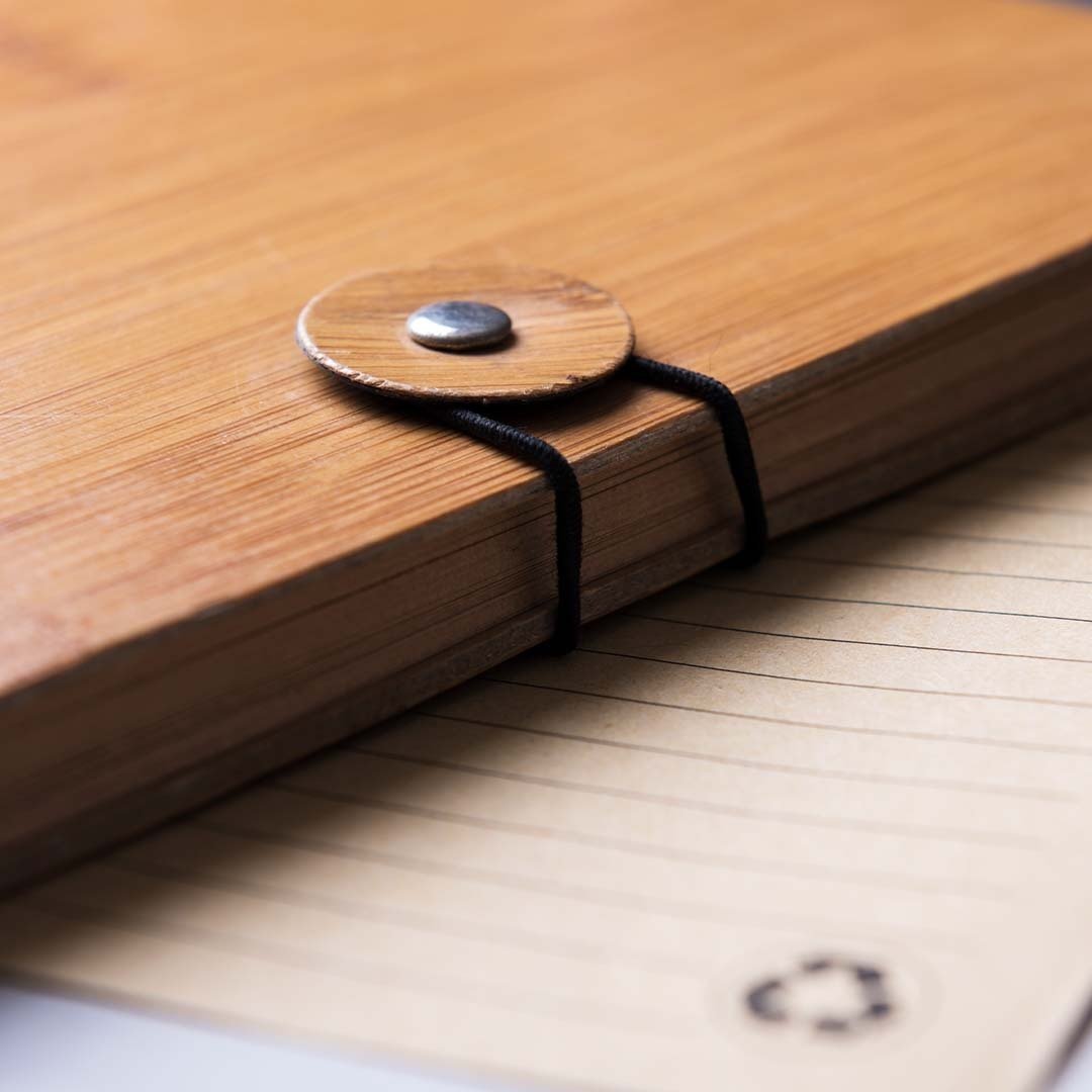 Libreta de anillas en línea nature con tapas rígidas de bambú y original cierre elástico. Incluye 80 hojas con disposición a una raya y diseño eco.