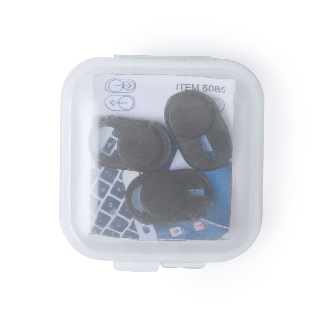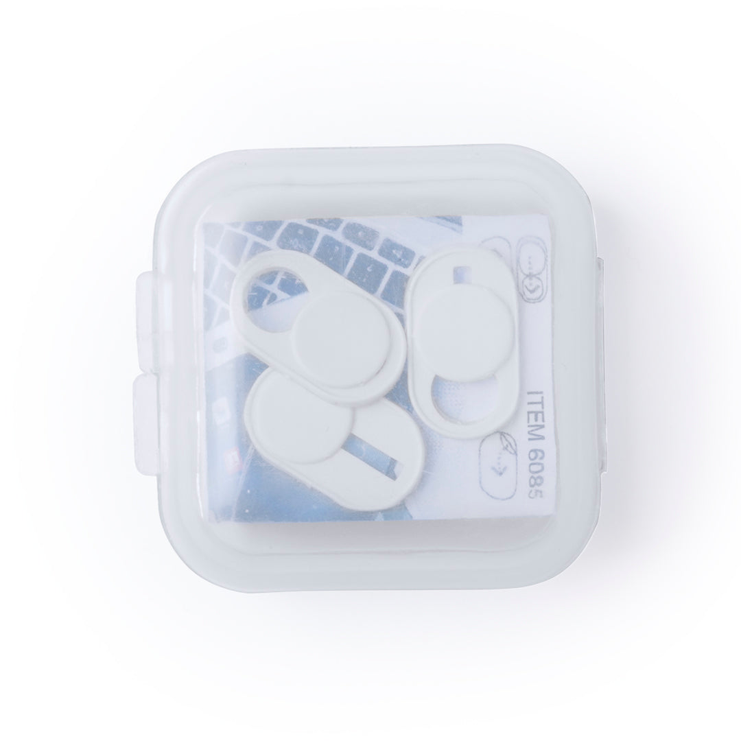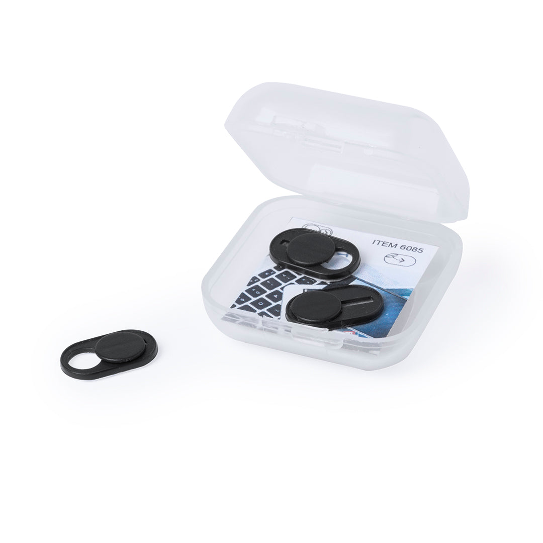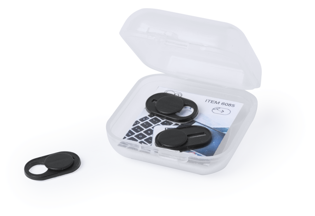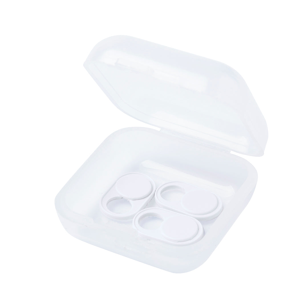 Tapa para cámara de dispositivo móvil para proteger la privacidad. En tamaño ultra compacto y servida en estuche individual de achado translúcido con 3 piezas. Disponible en colores blanco y negro, set presentado en bolsita individual con cartulina de diseño.