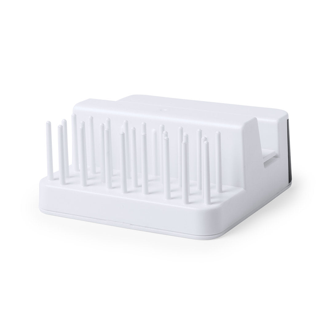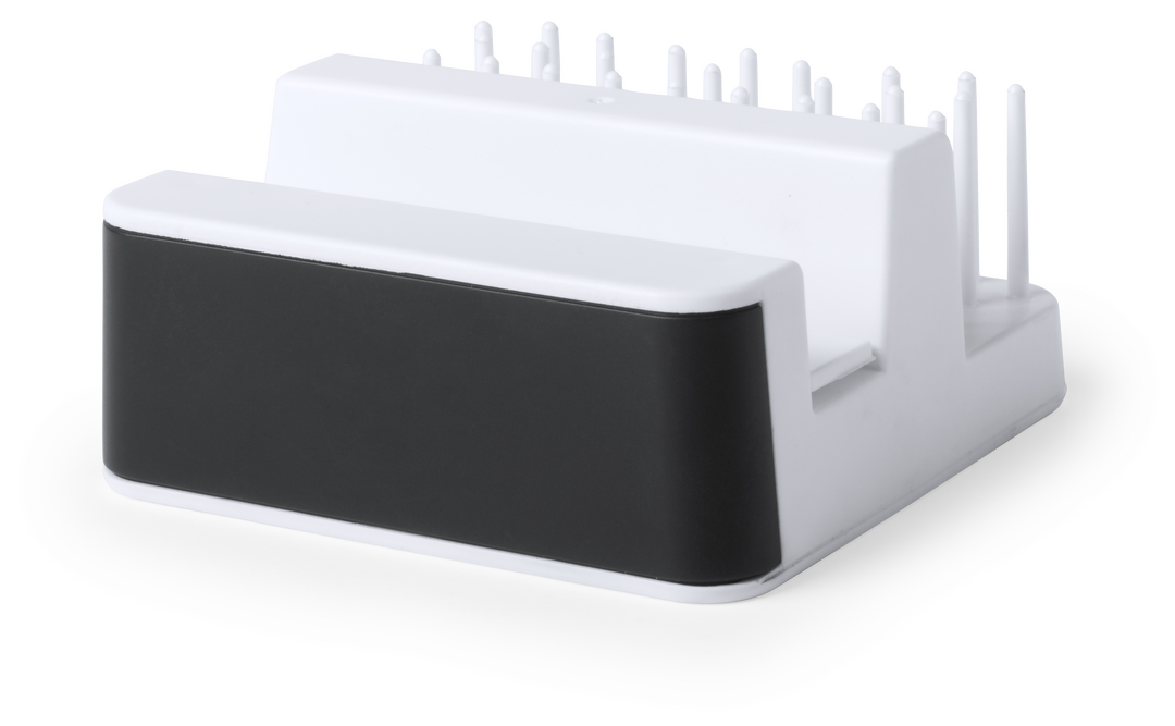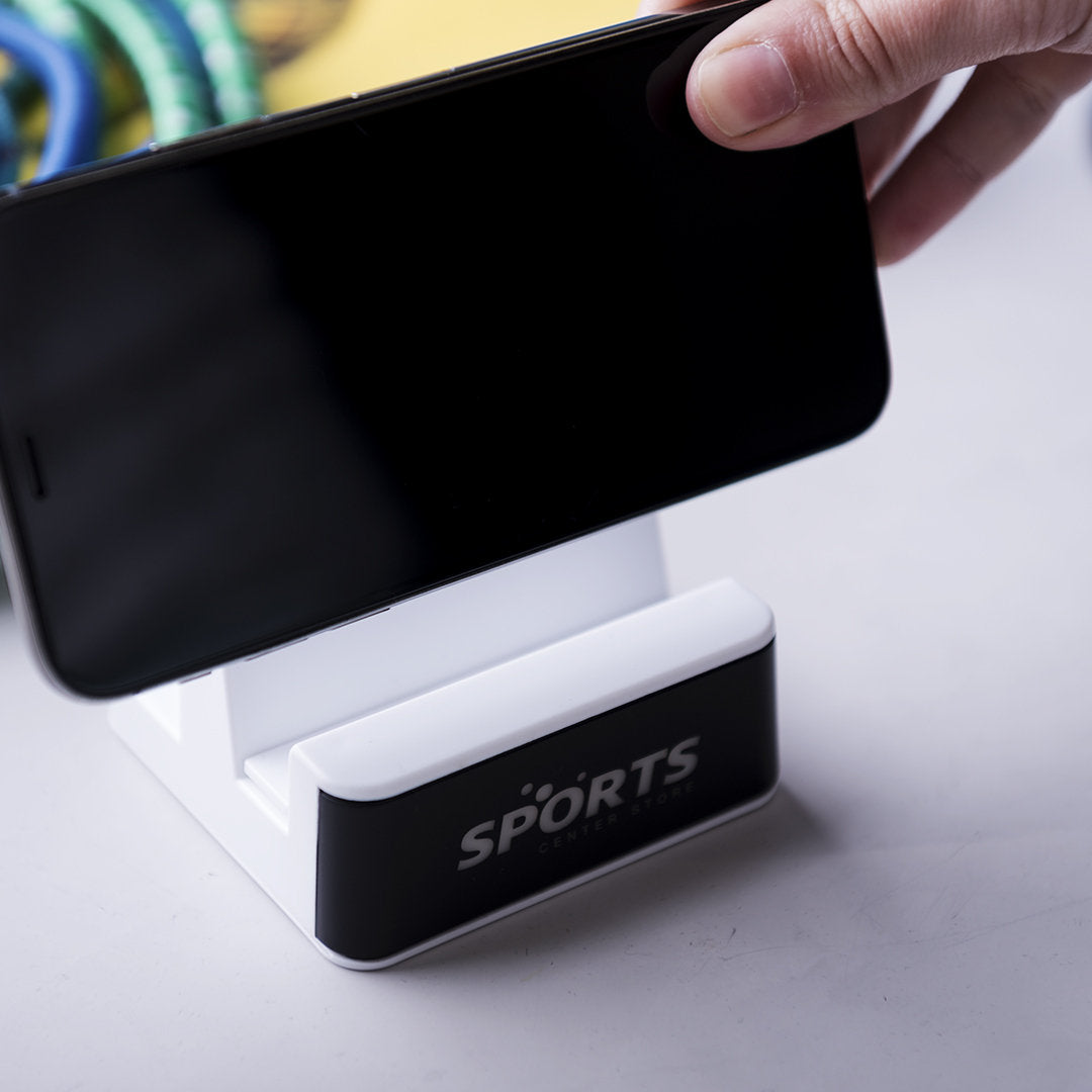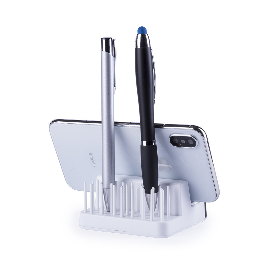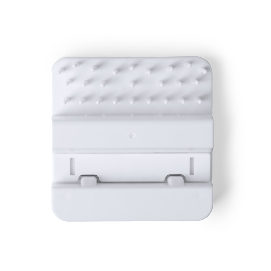 Soporte para smartphone o tablet en diseño minimalista de color blanco con organizador en la parte trasera. Área de marcaje frontal especialmente diseñada para grabación en láser y así conseguir que tu publicidad o marca quede originalmente iluminada con luz blanca.