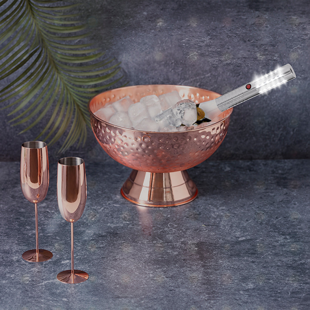 Bastón LED con 3 modos de luz: alta intensidad, media intensidad y luz intermitente. Equipado con 36 LEDs y botón de encendido/apagado. Su tamaño es ideal para acoplar en botellas, destacando en cualquier evento.